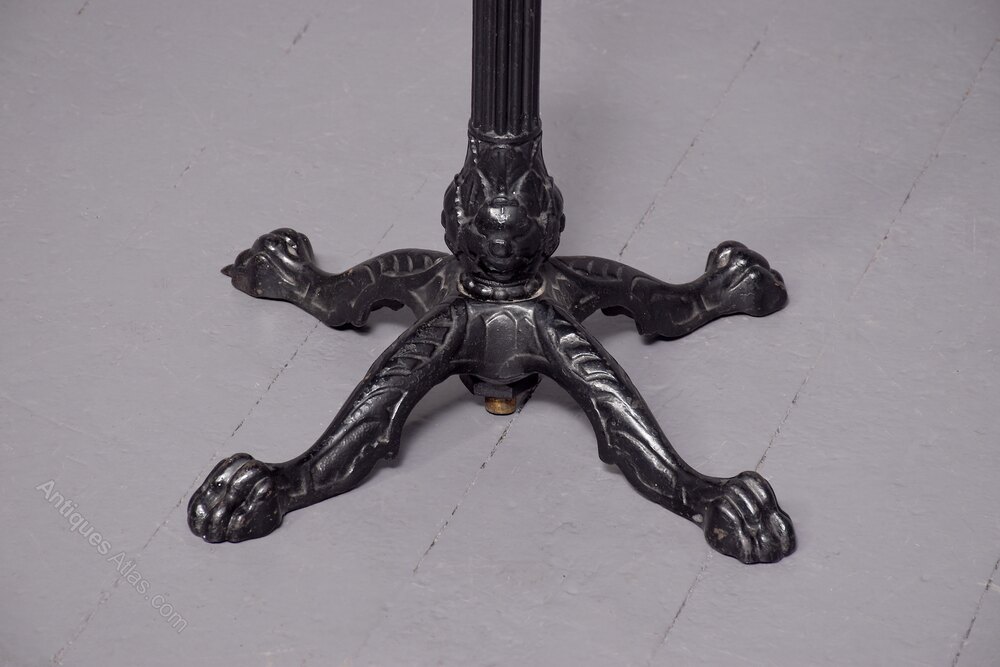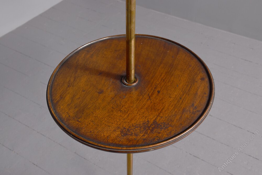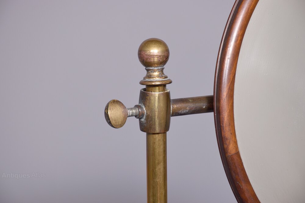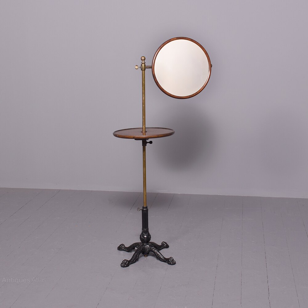 Circa 1870, an unusual stylish cast iron, brass and mahogany adjustable toilet stand/ occasional table, the circular mirror framed in mahogany with a brass arm with a butterfly in the back for tilting, this is supported on a brass upright (adjustable), with a circular mahogany table in the centre of the upright, with a stylish beaded fore-edge, support on a brass column resting on an unusual and stylish cast iron base which includes a fluting, foliate carving, finishing with an animal stylish foot.Height 140 cm. adjustable, 60cm wide, 38cm deep,