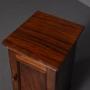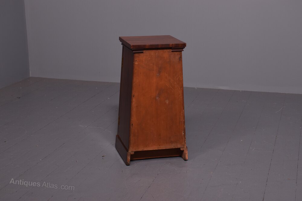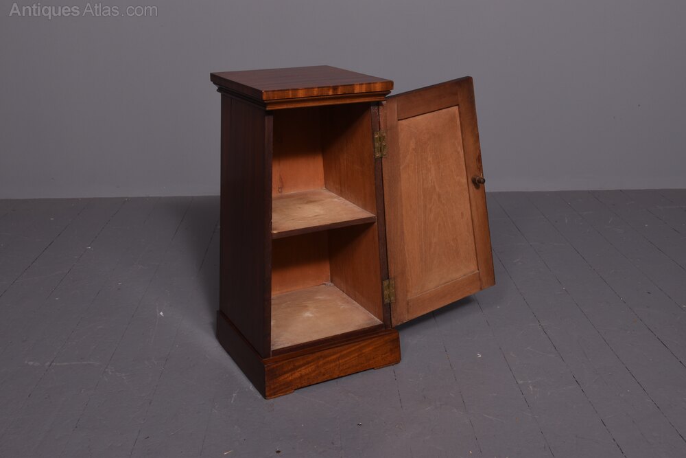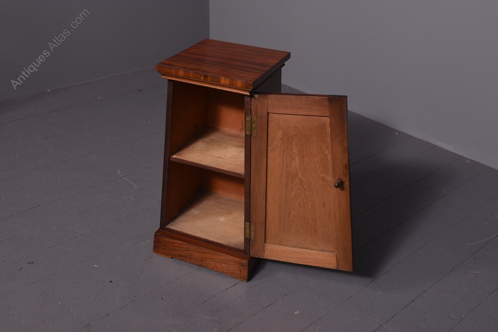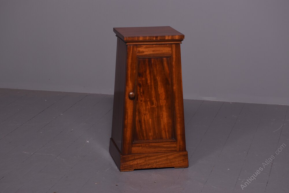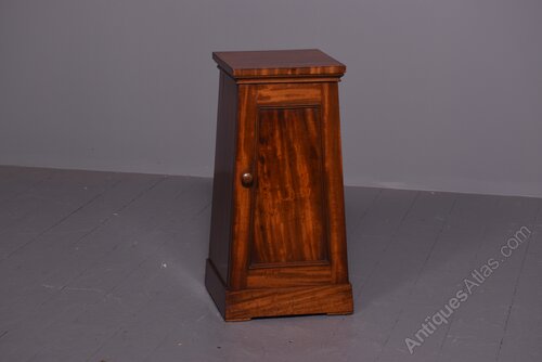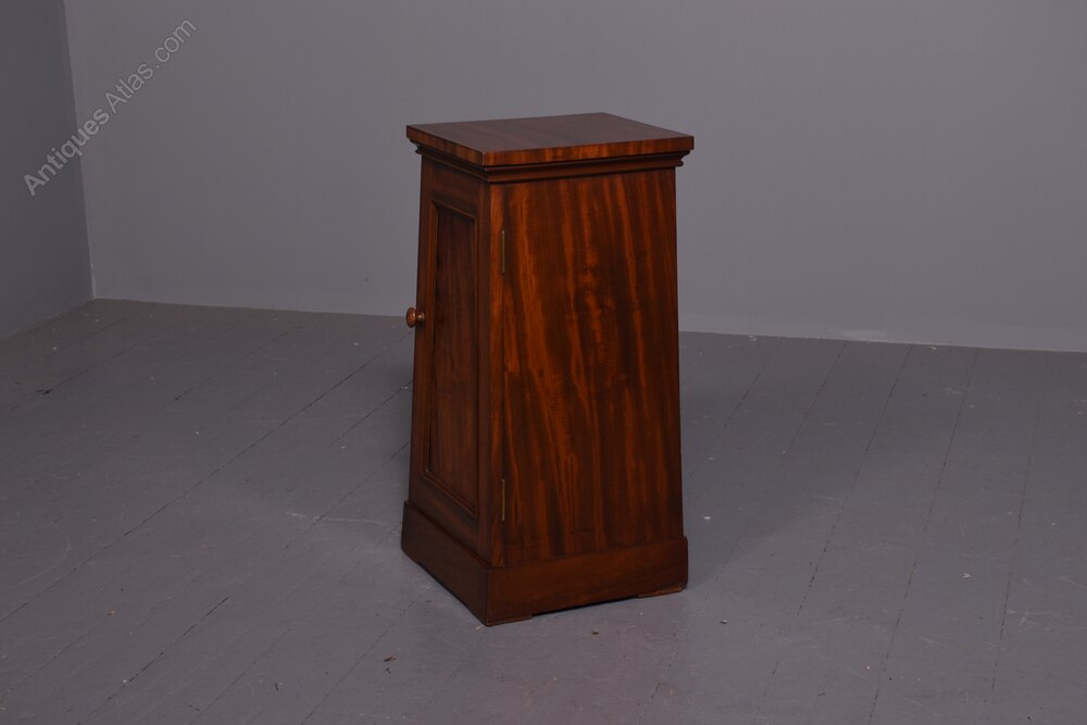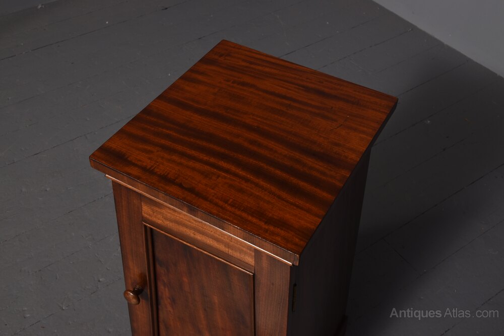 Circa 1750. Mid Victorian metronome-shaped bedside locker in figured Spanish mahogany. The rectangular top with traditionally restored French polish over a single panelled door, with original knob handle, opening to a shelved interior all supported on an enclosed plinth base.35cm Wide, 38cm Deep, 73cm Tall