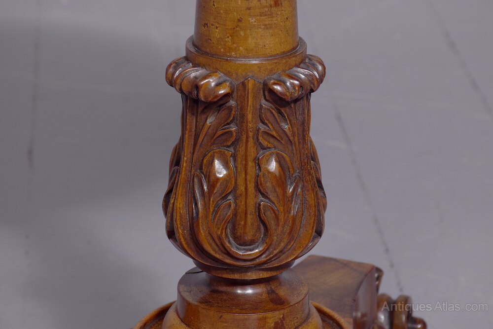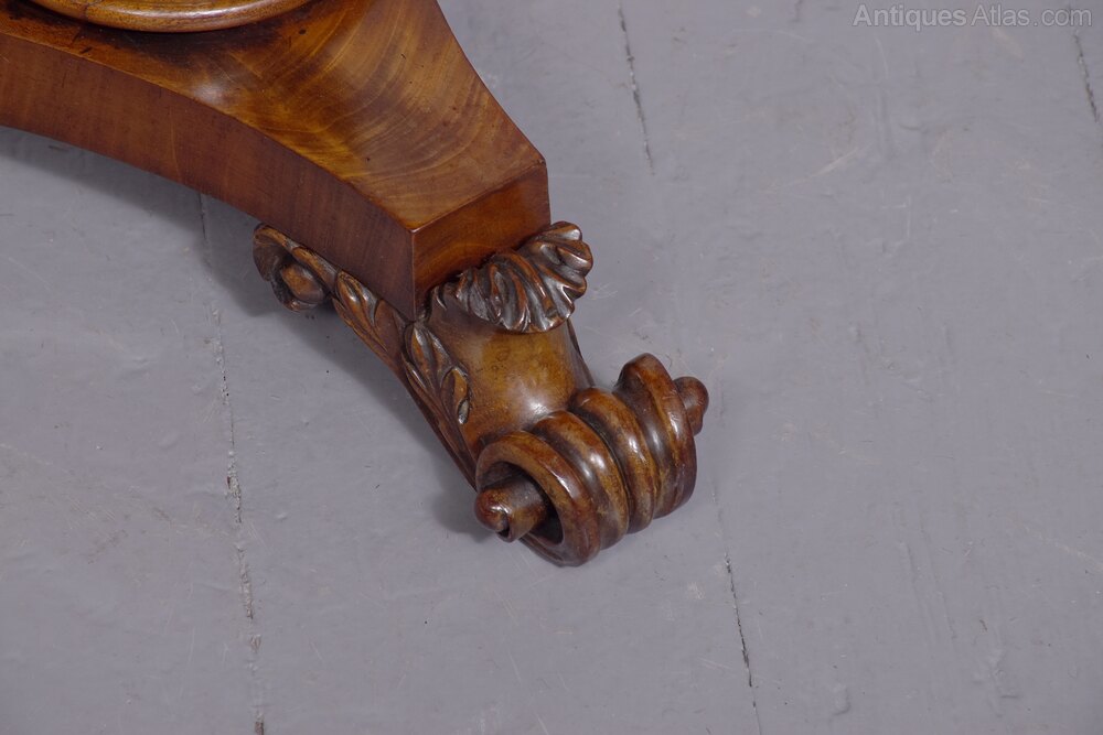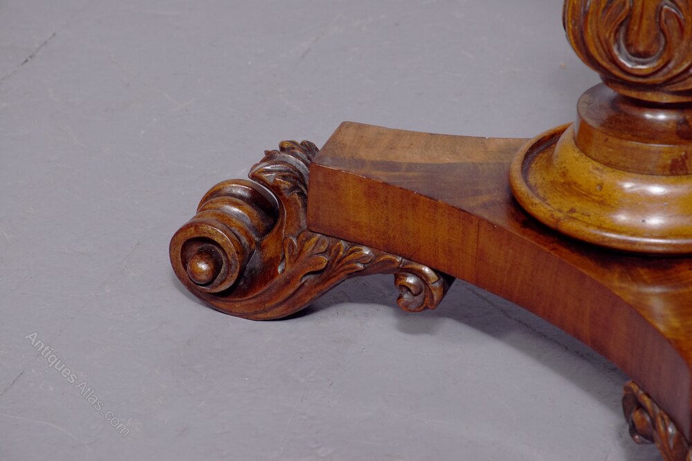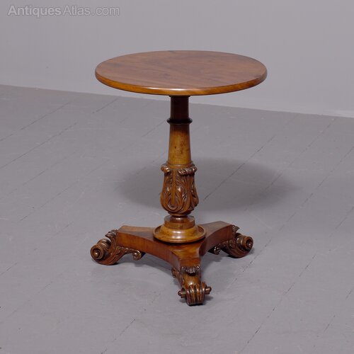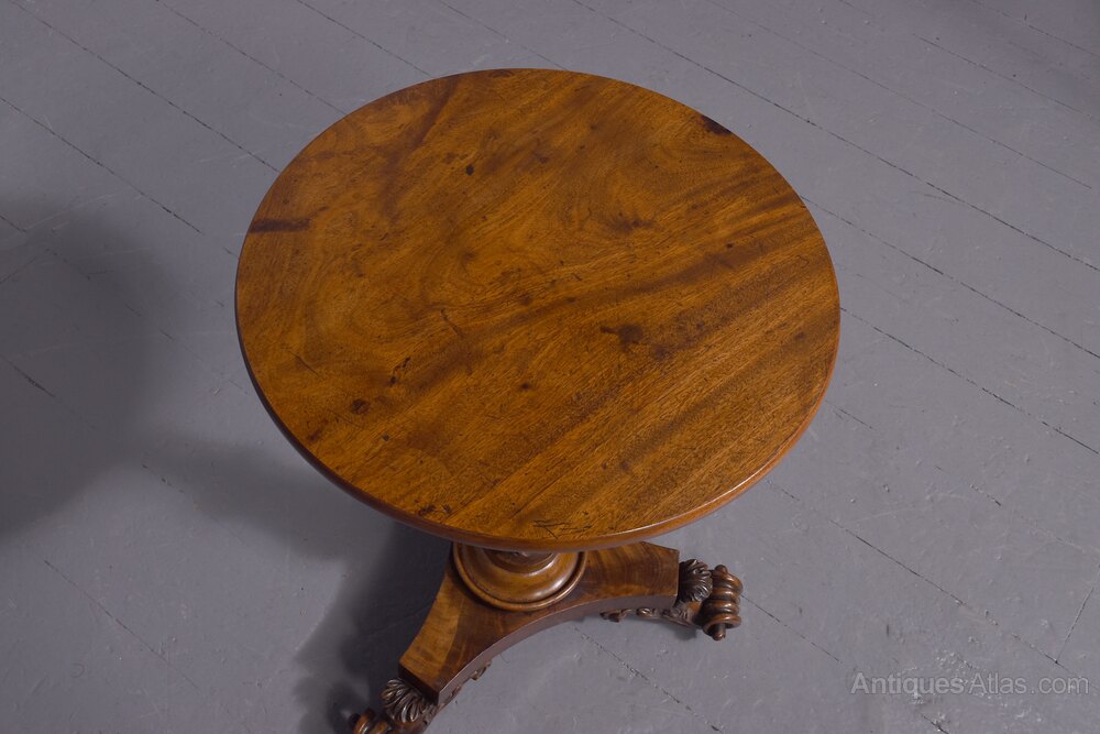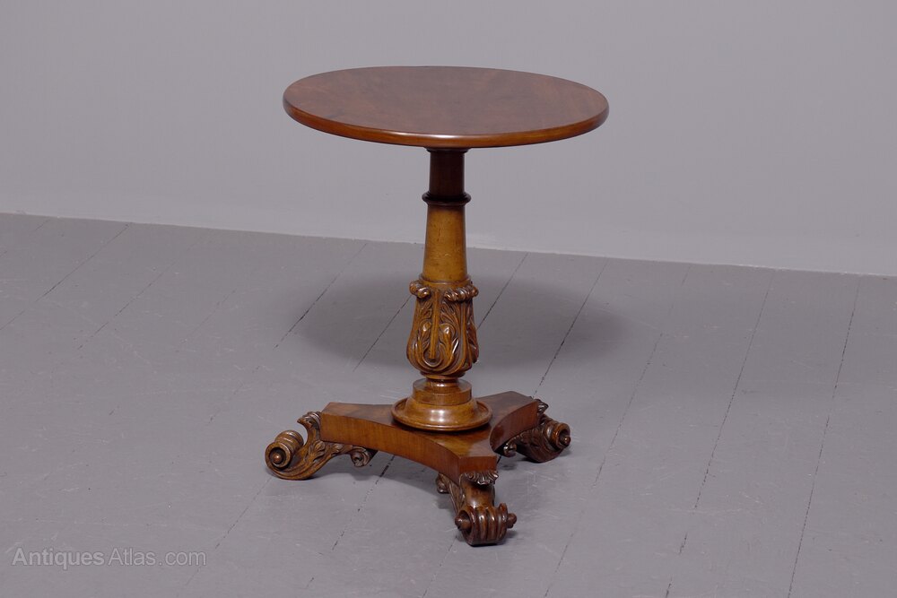 Circa 1830 with alterations. Fine quality carved mahogany William 4th wine table. The circular top with a mellow colour and nice figuring over a tapering acanthus carved stem with a turned collar above a flame mahogany tripartite base with elaborate acanthus carved scrolled feet. Fine quality functional item in pristine condition.45cm diameter, 56cm tall