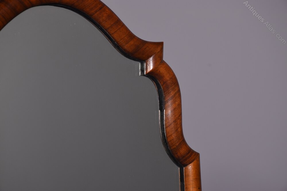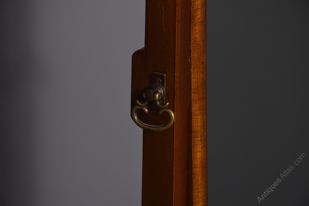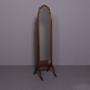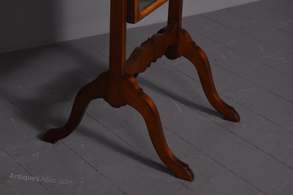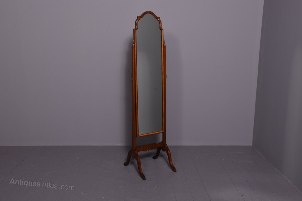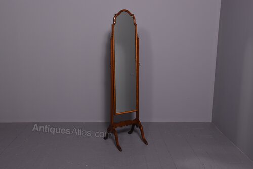 Circa 1920. Neat- sized Queen Anne-style mahogany cheval mirror. The mirror frame with a shaped top and a moulded frame in polished mahogany. With the mirror plate in excellent condition, on rectangular supports with turned finials and brass axehead handles above a shaped stretcher and supported on twin cabriole legs each side.165cm Tall, 42cm Wide, 47cm Deep