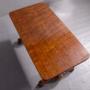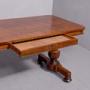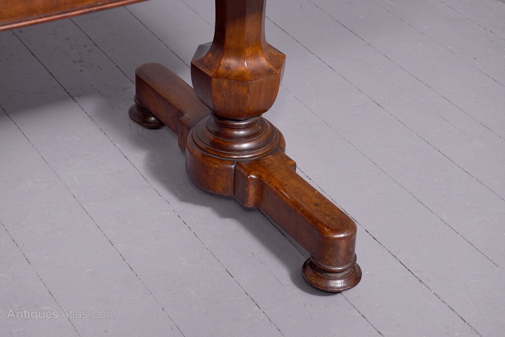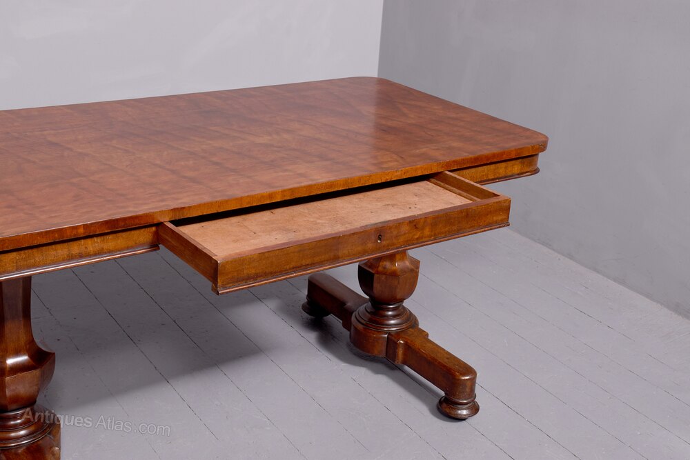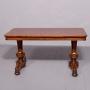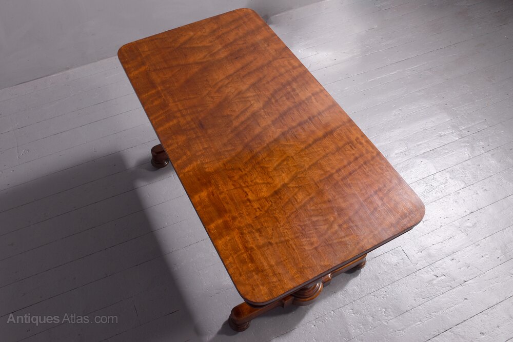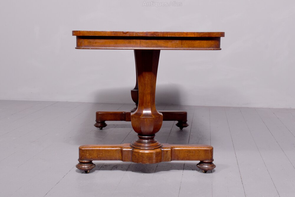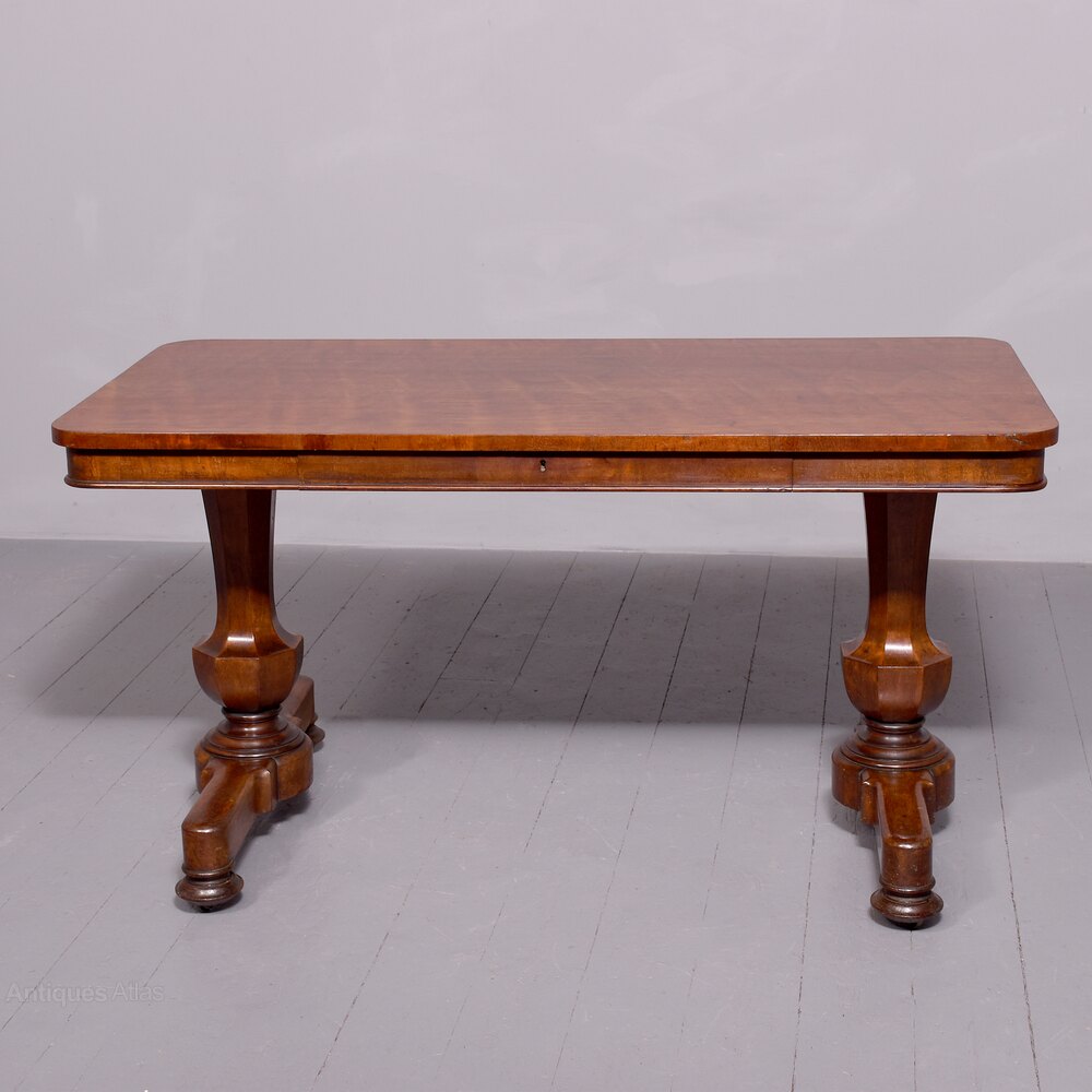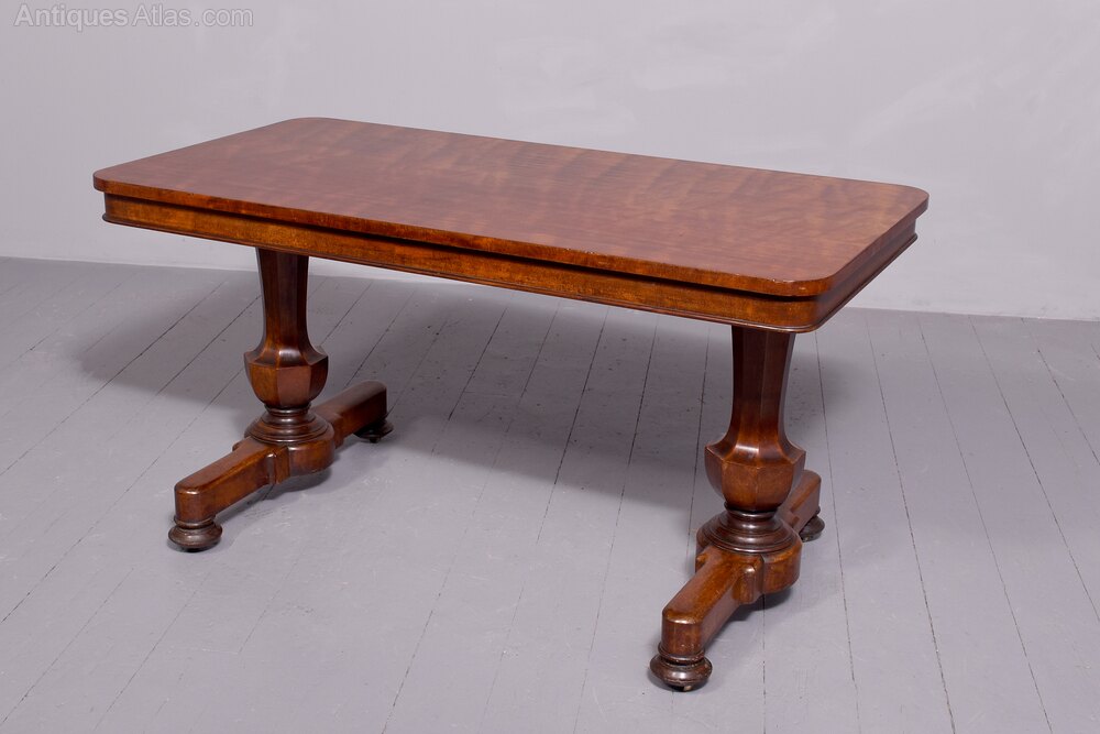Circa 1820. Quality Wiliam IV freestanding figured mahogany library table. The rectangular top with rounded corners in a beautiful plum pudding figured mahogany, with cross-banded fore-edges over a simple moulded frieze. Supported on two shaped octagonal stems over elongated platform bases on turned feet with hidden brass casters. Lovely colour and patina.74 cm High x 141 cm Wide x 71 Deep