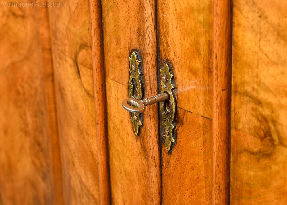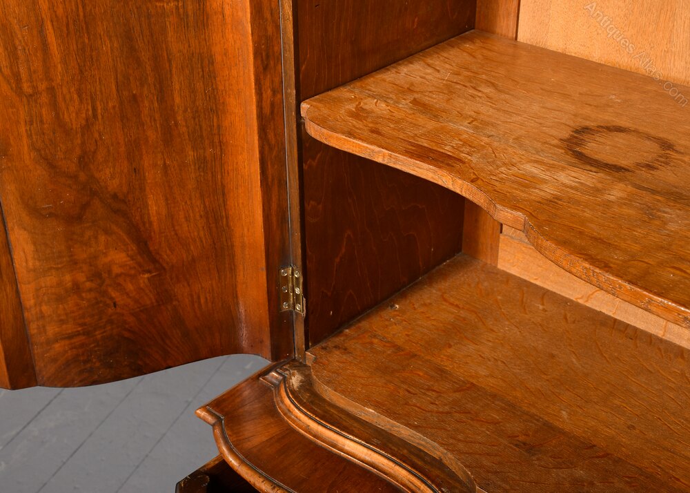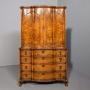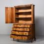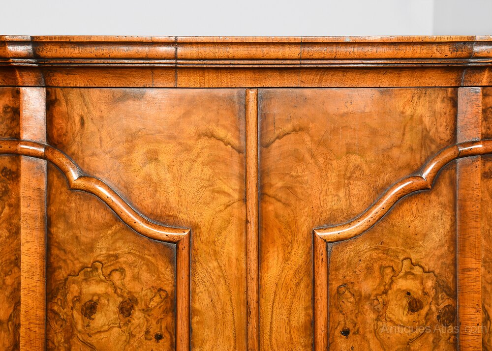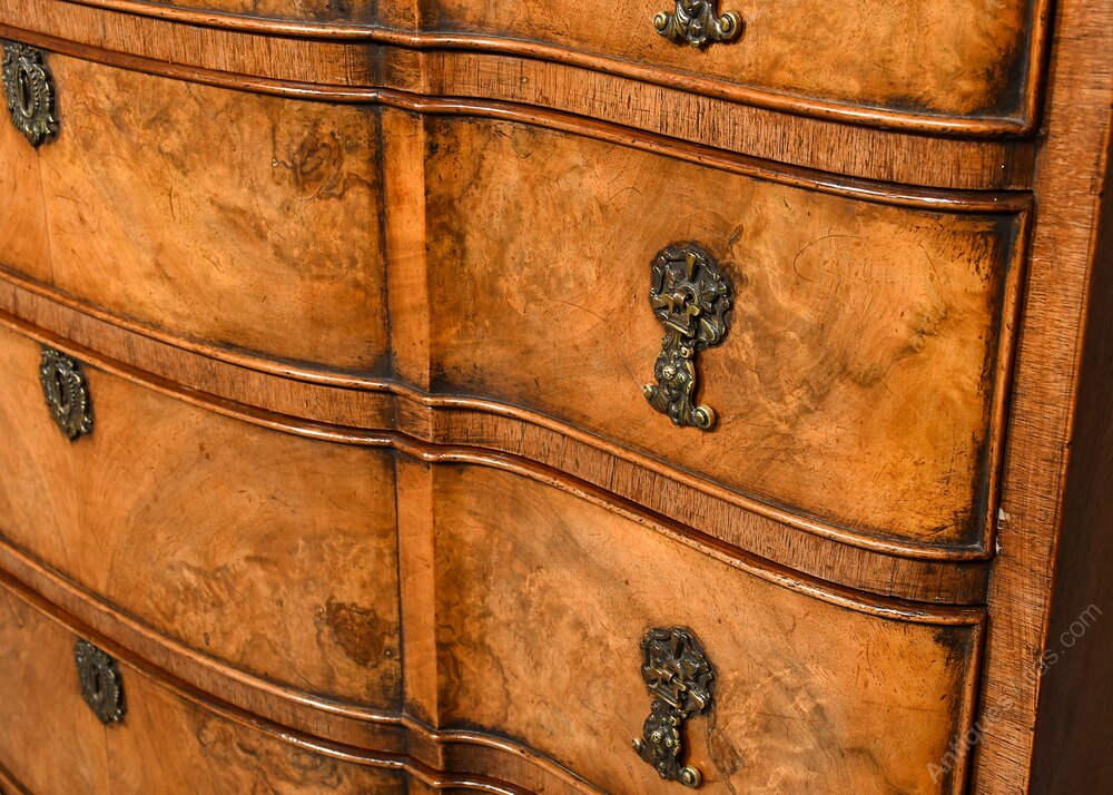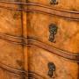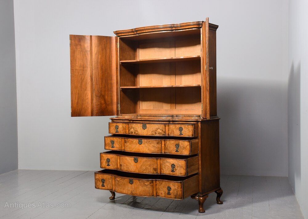 Circa 1920s. Stylish Dutch style burr walnut shaped front cabinet on chest, the polished top with elegant moulded cornice, the front with a pair of full-length shaped doors with moulded arches and burr walnut panels, inside the cupboard is a pair of shelves with follow the form of the front, the base with a flat polished surface, and four full length graduating drawers, each is shaped as the top and have pierced cast brass escutcheon, elegant drop handles, beneath the bottom drawer there is moulding and the chest rests on four elegant squat cabriole legs with extended quarter brackets with C scrolls, finishing on a pad foot.168cm High, 103cm Wide, 47cm Deep