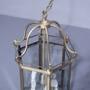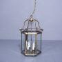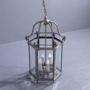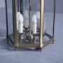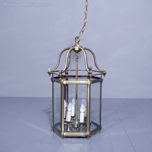 Circa 1980. A large brass glass Hall Lantern. The hexagonal shaped lantern with six shaped uprights capped with a large loop and chain with a single arm hanging down holding six bulbs with six glazed bevel edged rectangular panels. The glass is held in place by brass straps on the inside. Below the glass there are six more downward facing finials. Large clean lantern140 cm H (including chain) x 41 cm x 41 cm