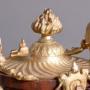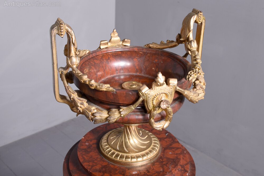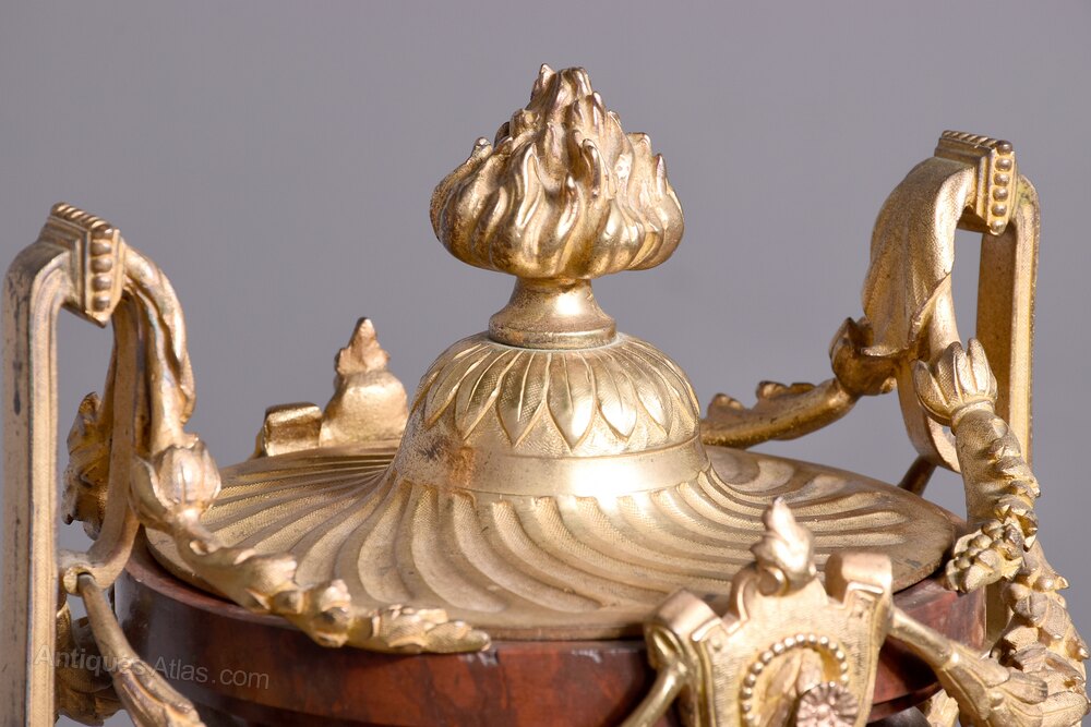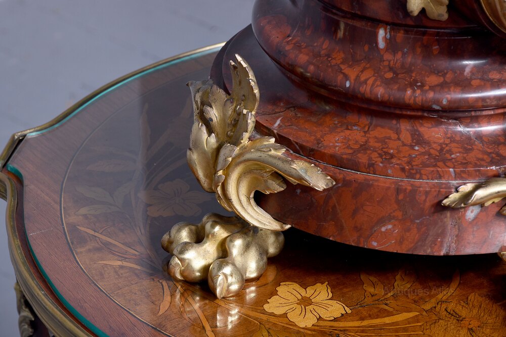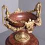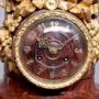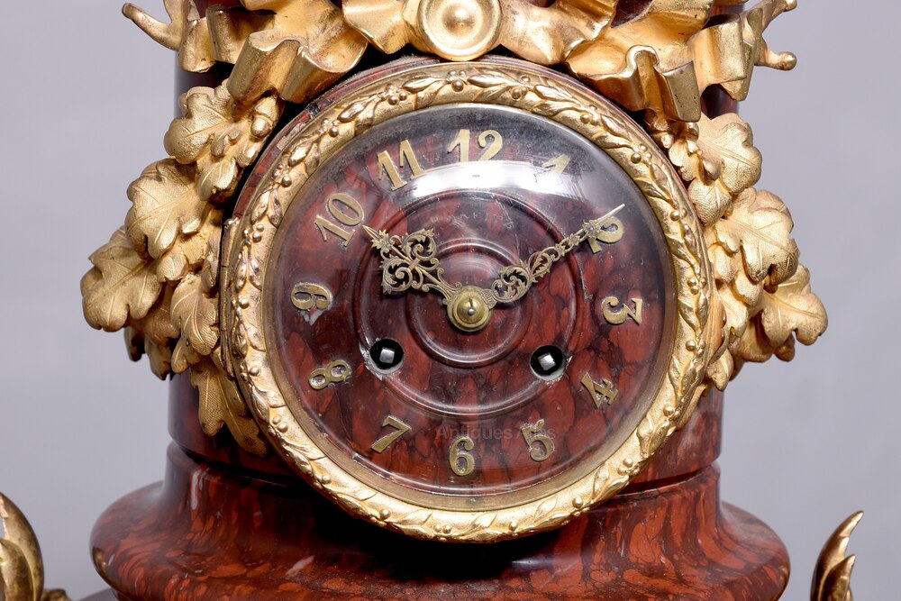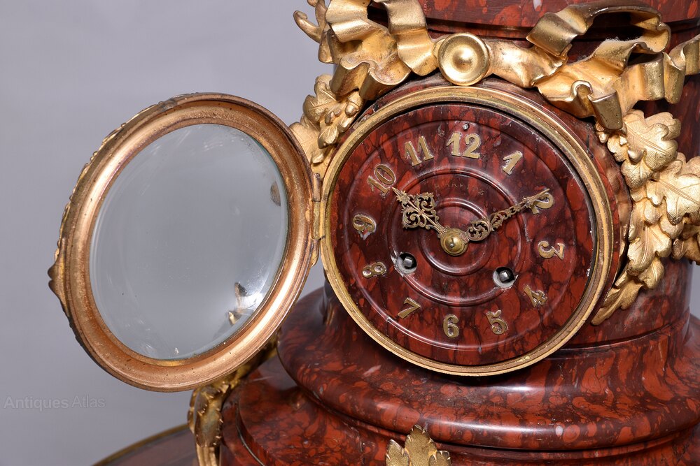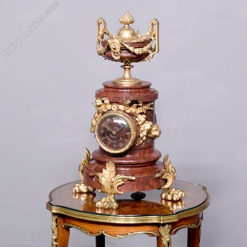 Circa 1870. A large French gilt bronze-mounted rouge marble mantel clock, the dial is signed ‘H Kreitz’, the Arabic dial with decorative hands set within an elaborate brass bezel, the brass twin tray movement striking the hour and the half hour on a polished bell, the case surmounted with two handled, lidded urn mounted and resting on a stylish fluted marble column, raised on three cast lion feet.58cm High, 36cm Dia.