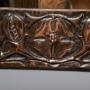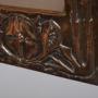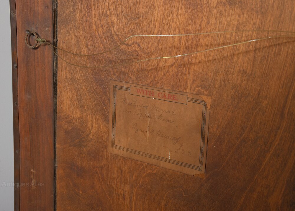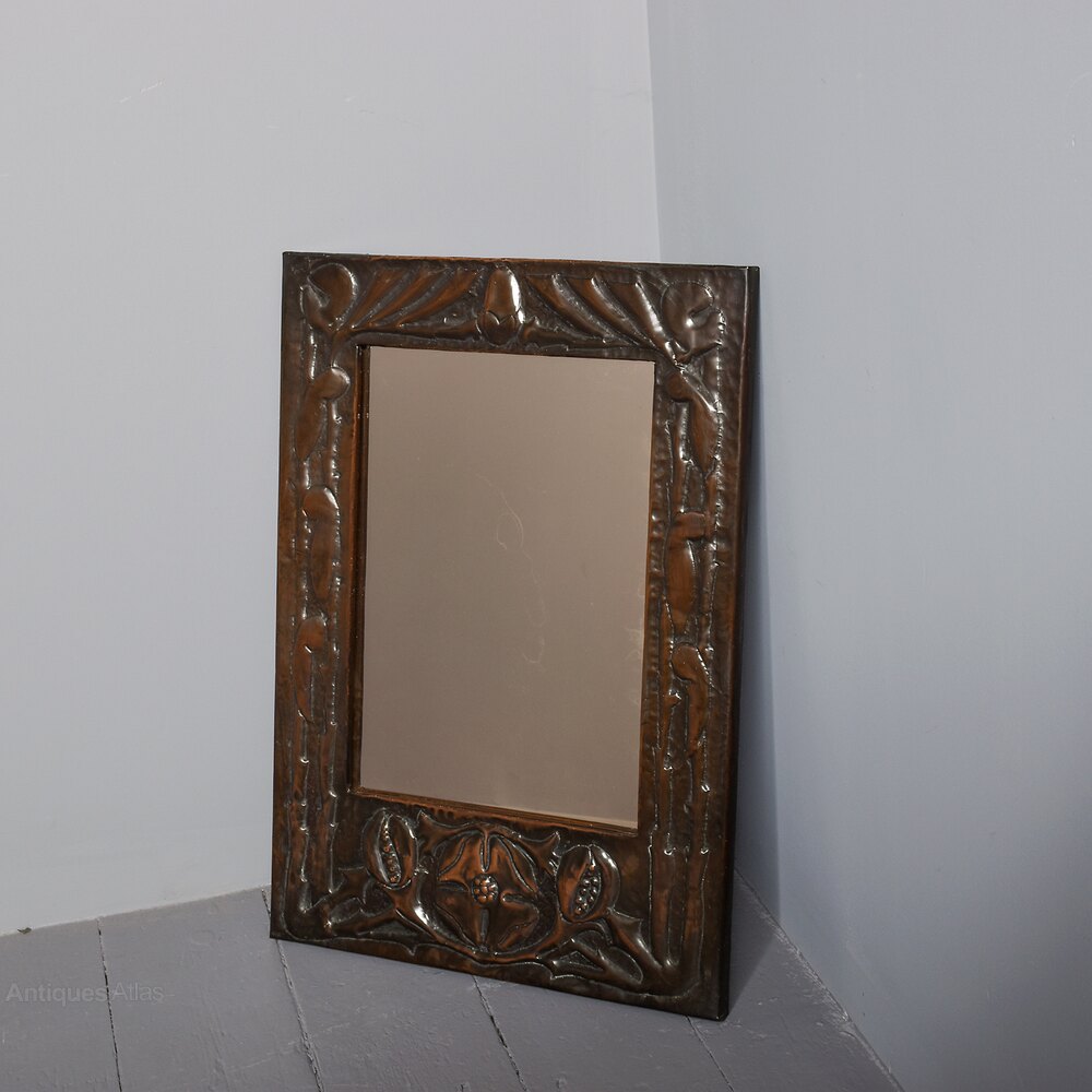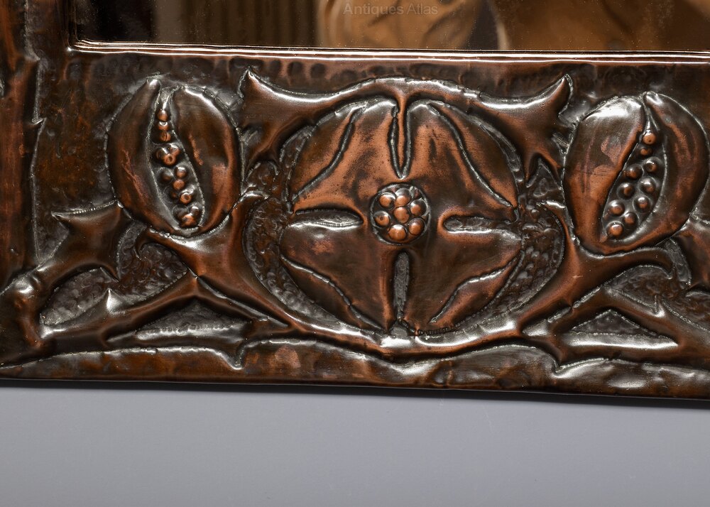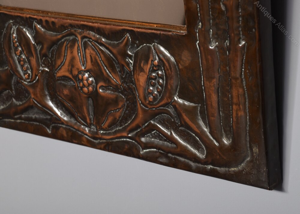 Circa 1900. A stylish copper-framed Art Nouveau mirror, the rectangular frame retaining the original mirror plate, the frame with a mixture of planishing and embossing, including pomegranates and flower-heads with double pattern up the sides, the planished copper has been folded over the frame on all sides, giving a lovely finish to the mirror.60 cm H x 43 cm W