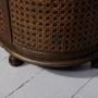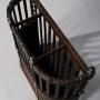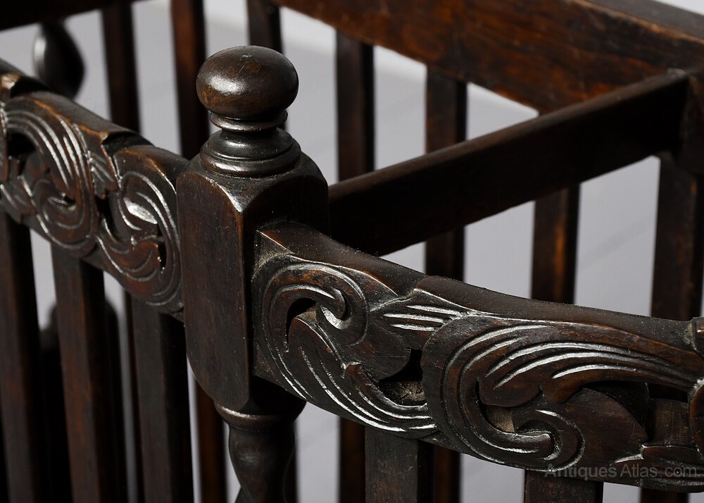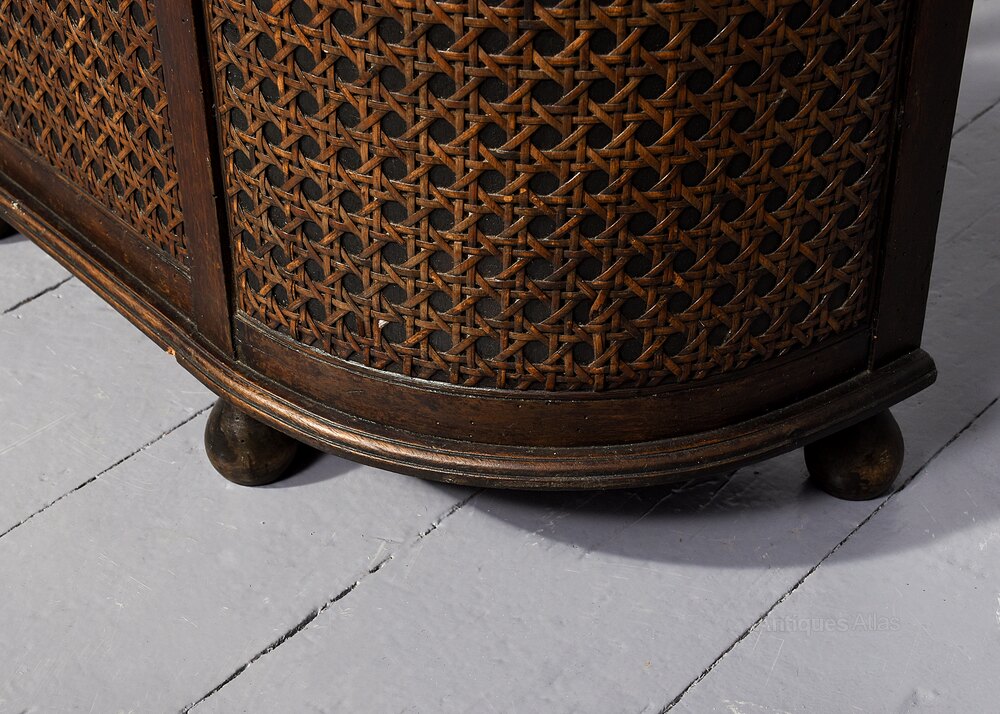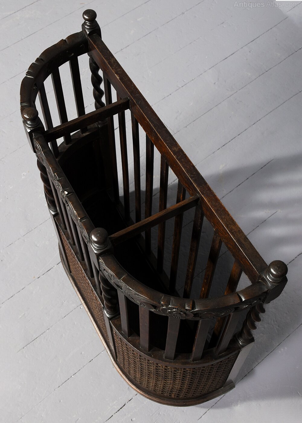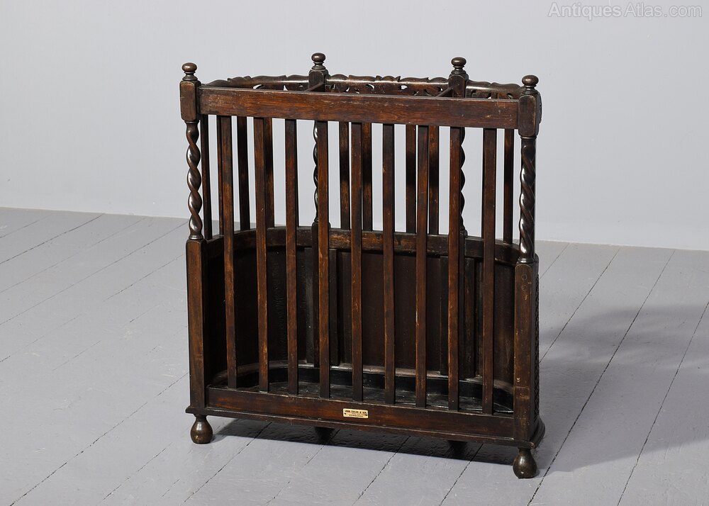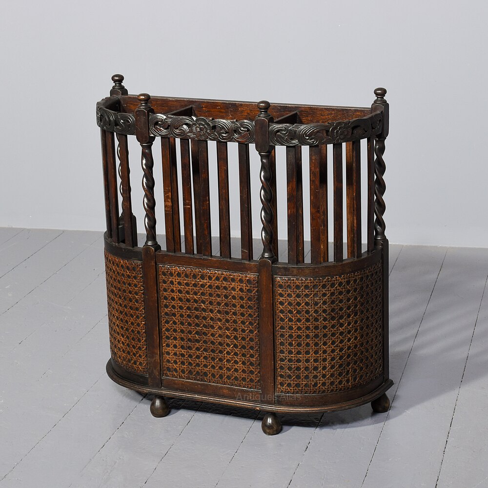 Circa 1900. A stylish Edwardian oak and Bergere 3 division stick stand, the top with curved sides surmounted by 4 finials, the front rail is carved and pierced with flowers and scrolling foliate carving, held in place with barley sugar uprights and a simple spar, the three panels at the bottom in Bergere with a solid back, the base with a lift out drip try, all resting on four stylish tapering bun feet76 cm H x 69 cm W x 23 cm D