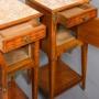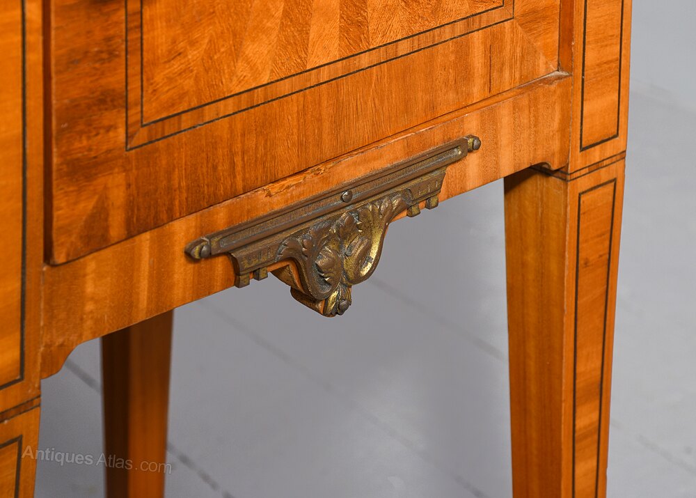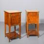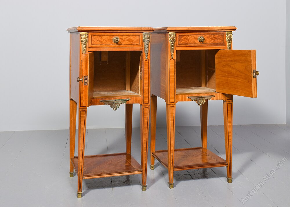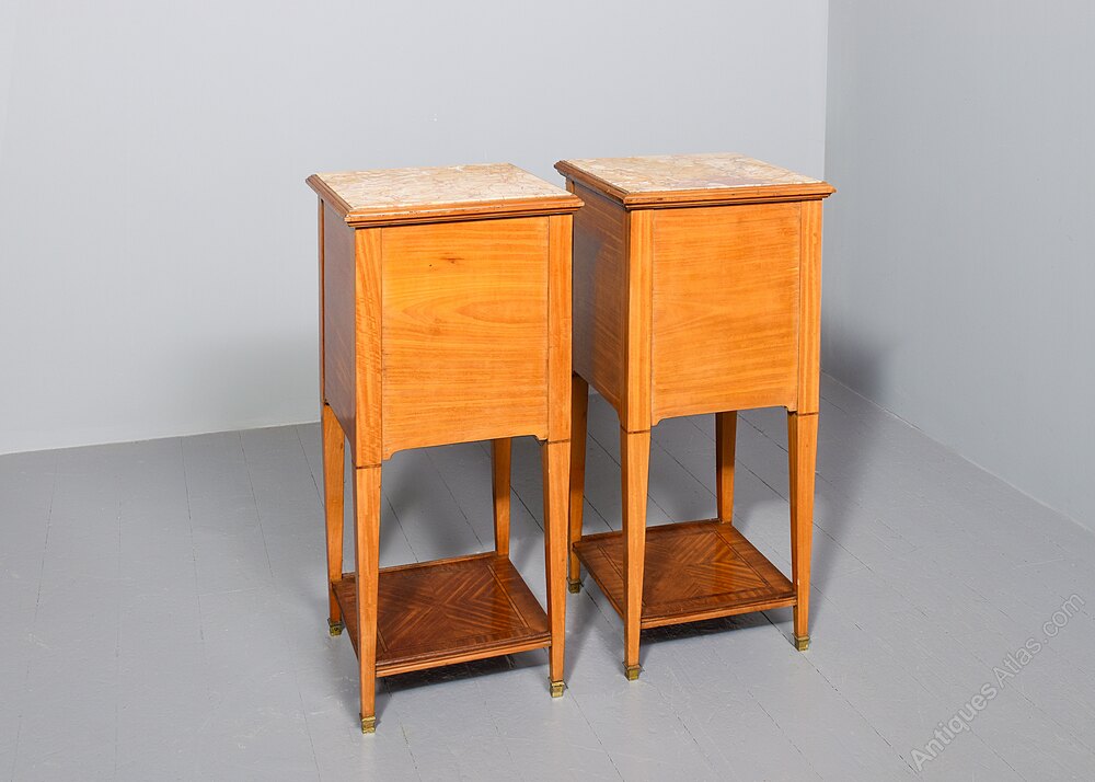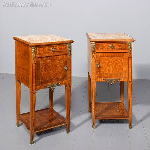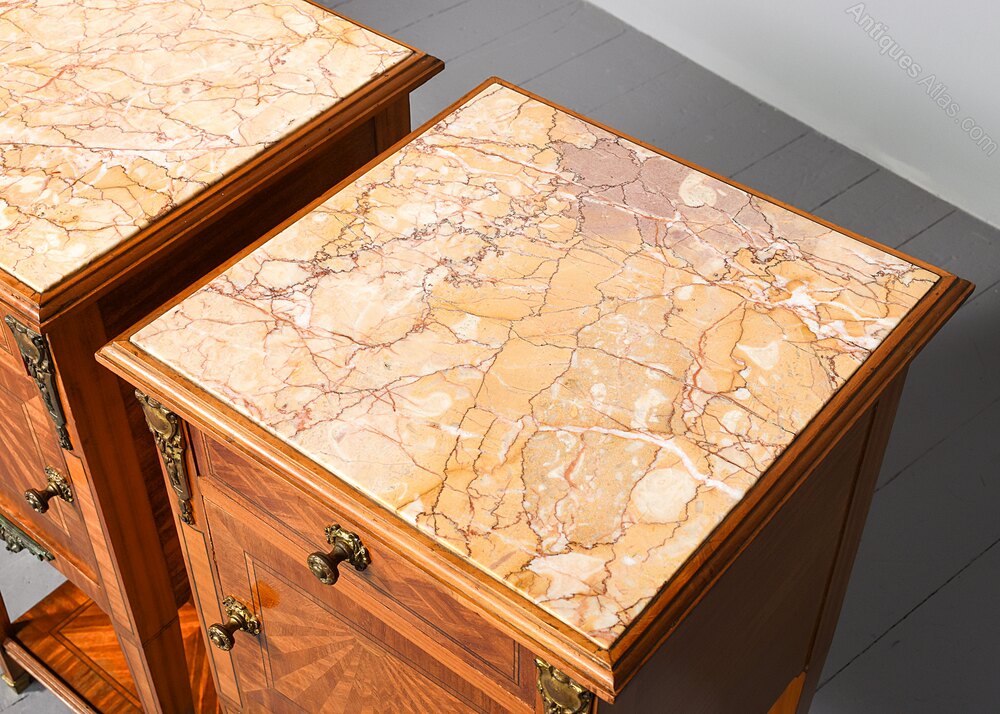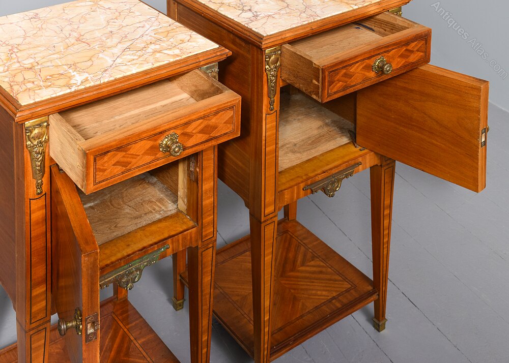 Circa 1880. A pair of exhibition quality French pink variegated marble top bedside pedestals, the tops in wonderful pink variegated marble within a moulded frame, the frieze with a full-length drawer with broad banding, inlay and geometric parquetry, flanked by a pair of gilded mounts, below a cupboard with a similar handle and a sunburst in geometric patterns with satinwood and kingwood inlay, the frieze with a stylish mount, resting of four square tapering inlaid legs, intersected by a shelf with similar inlay to the doors, on cast brass feet, the pair of pedestals are polished on all sides making them freestanding.85cm High, 40cm Sq.