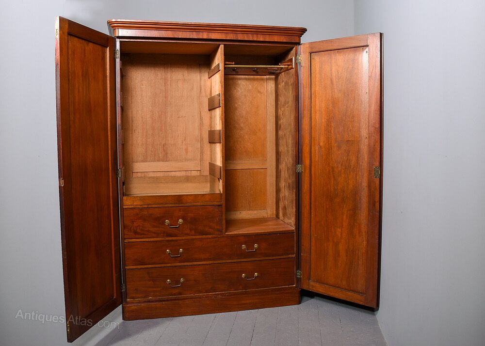 Circa 1860. A mid Victorian two door mahogany wardrobe, the classic cornice with rounded corners, the front with two full length panel doors with elegant beading and a proud brass escutcheon, inside on the right there is space for hanging and on the left-hand side a mixture of hanging, slides and drawers, the wardrobe rests on an enclosed mahogany plinth following the form of the cornice, the wardrobe breaks into three sections – the cornice, the base and the body.209cm High, 140cm Wide, 60cm Deep