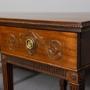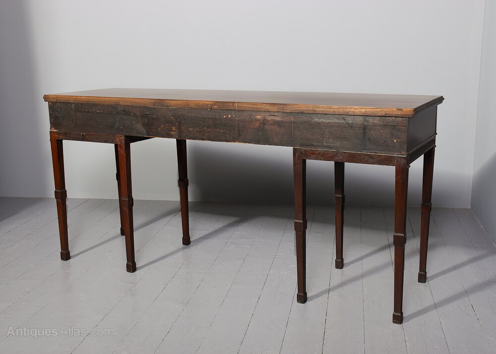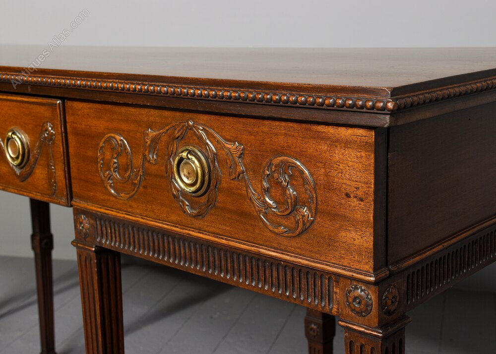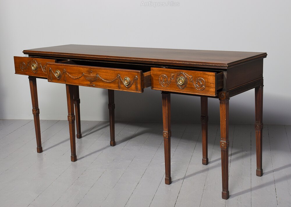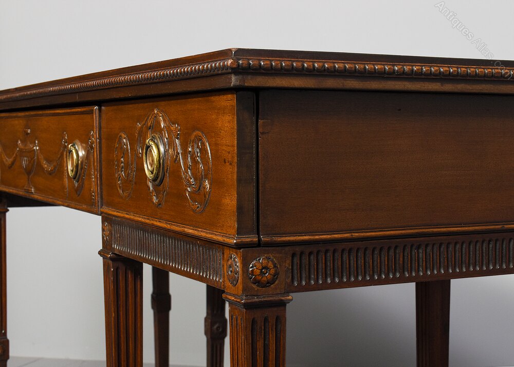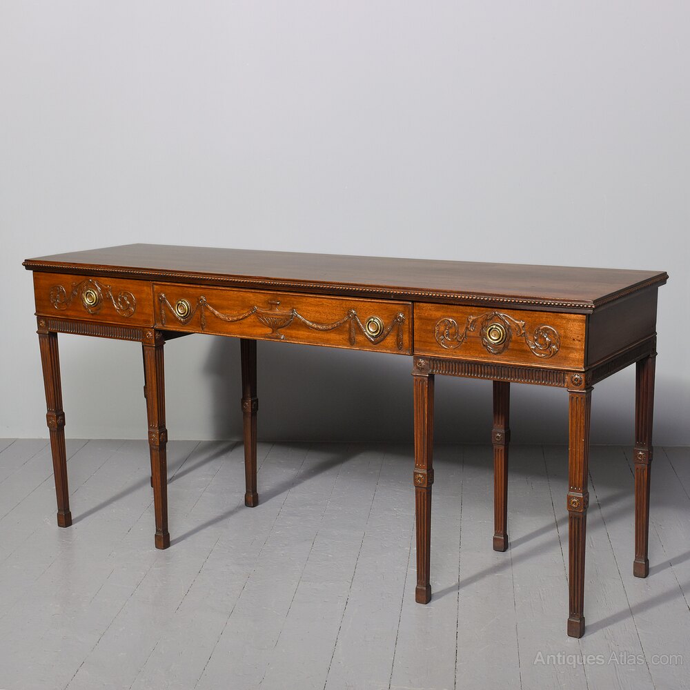 Circa 1880. Elegant Georgian Adam-style carved mahogany hall or side table. The top in figured Spanish mahogany with a beaded fore-edge above three frieze drawers with neo-classical carvings of scrolled foliage, urns and swags and with brass ring drop handles. The drawers with solid oak drawer linings and the sides with fluted aprons. All supported on eight tapering fluted legs with applied paterae, all on neat spade feet.182cm Wide, 53cm Deep, 86cm Tall