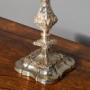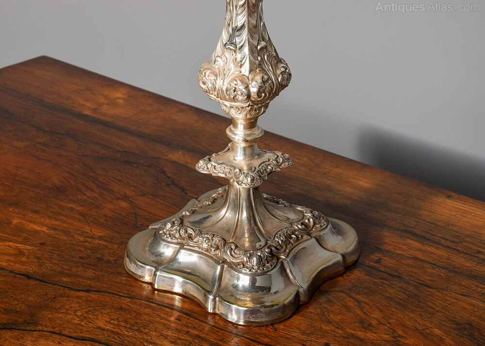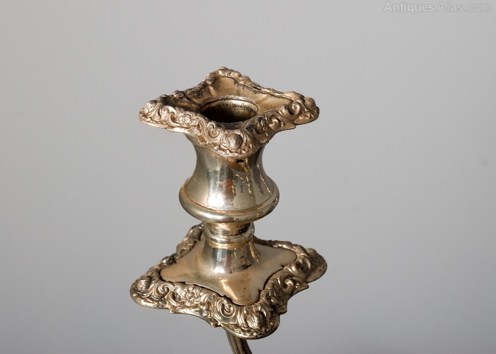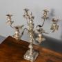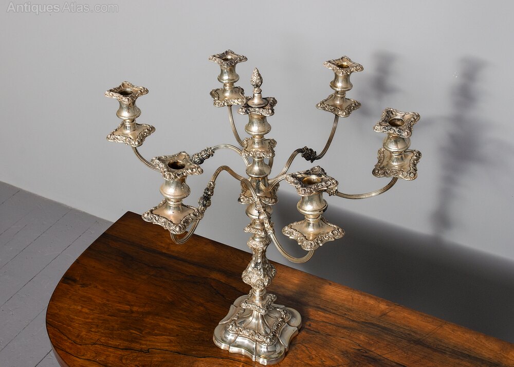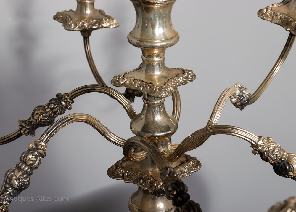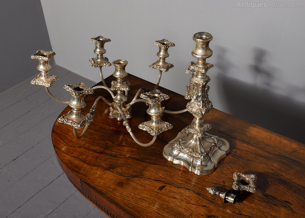 Circa 1900. A large six branch EPNS (Electro Plated Nickle Silver) candelabra, the central candle holder with a removable cap in the form of a flame, all candle holders with stylish removable nozzles with similar drip trays beneath, supported on curvaceous stems with foliate casting in the center, resting on a single stem which is faceted with foliate casting on most of the facings resting on a stepped shaped base.57cm High, 53cm Wide, 53cm Deep