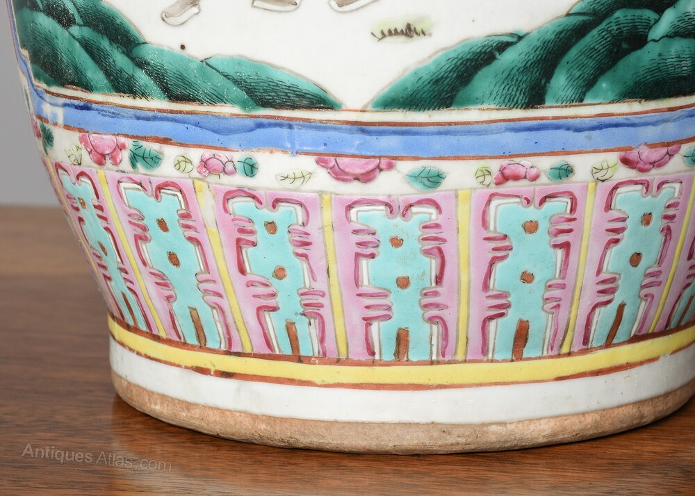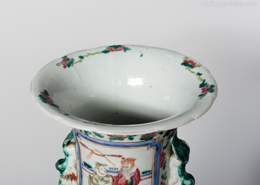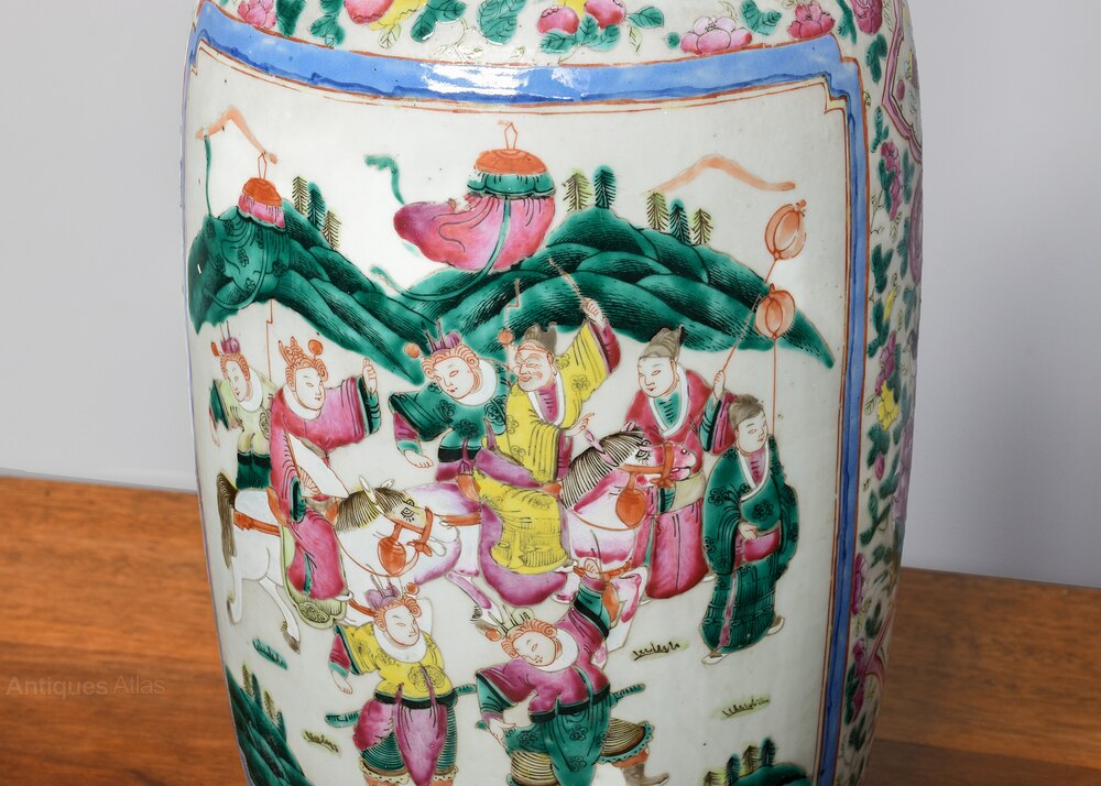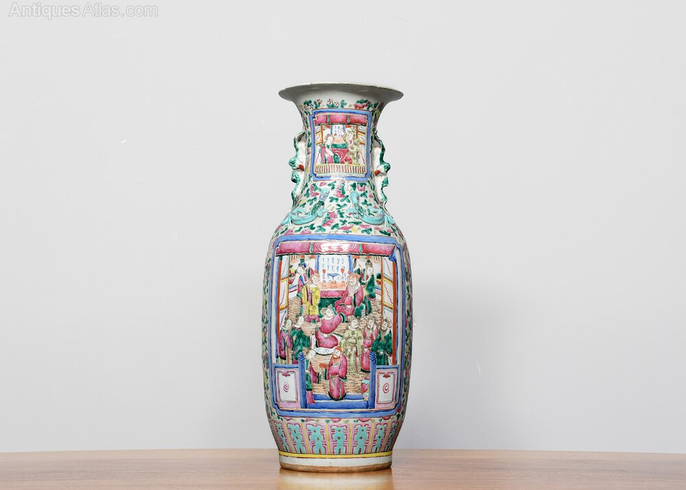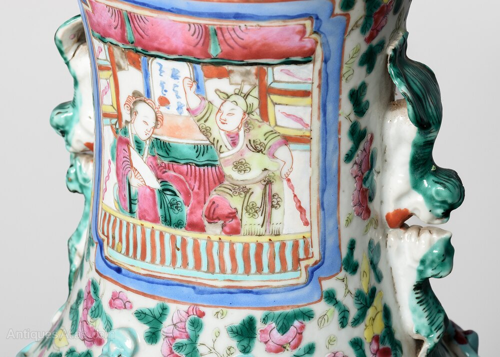 Circa 1870. Magnificent tall hand-painted Canton (Mandarin) vase in excellent condition. The tall vase with moulded dragon handles and applied lizards to the front has a large panel of groups of sitting figures with famille verte and famille rose colours. The sides with birds and chrysanthemum decoration, and the rear panel with a group of oriental horsemen and people celebrating. In overall excellent condition, some old minor chips to the rim.62cm Tall, 27cm Dia.