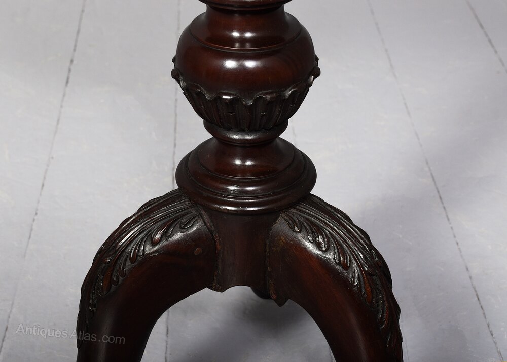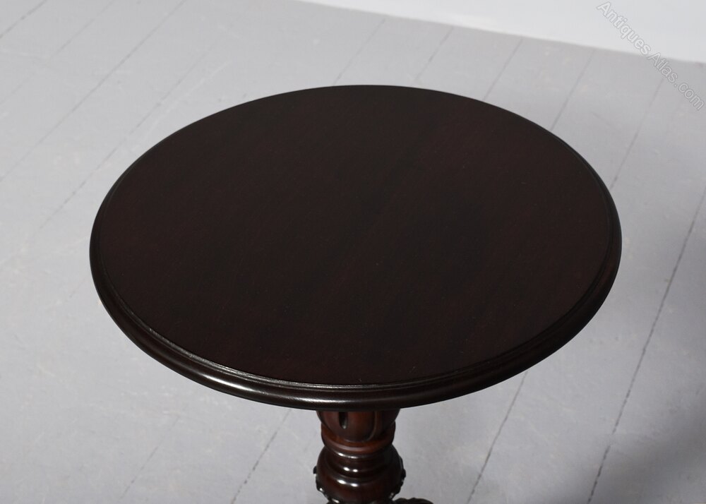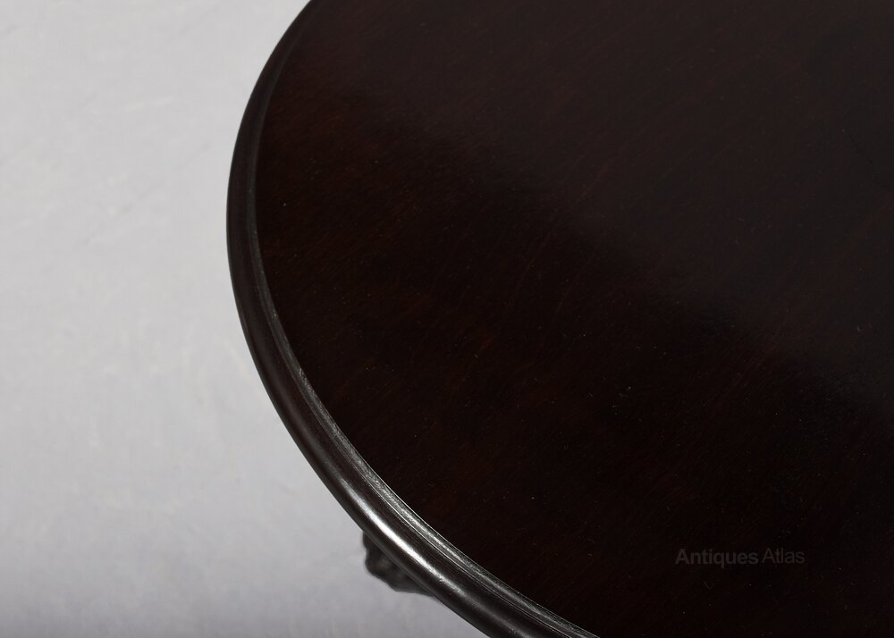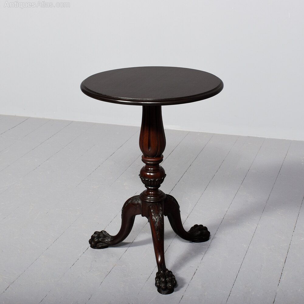 Circa 1860 (with restorations). 19th Century Chippendale style circular figured mahogany occasional table. The top in figured mahogany with a moulded rim above a vasiform fluted stem supported on three beautifully carved cabriole legs with acanthus carved knees and lion claw feet. Traditionally restored and in excellent condition.69 cm H x 50 cm Dia