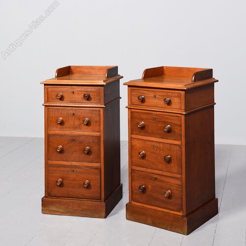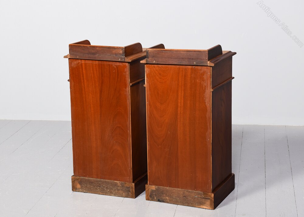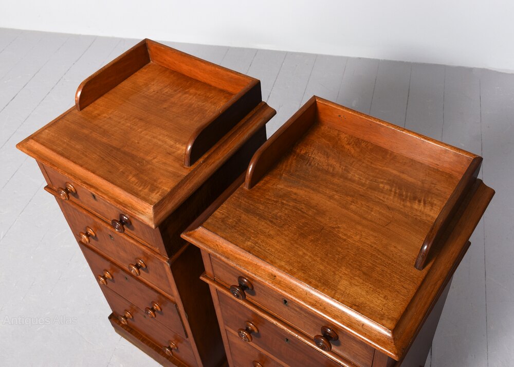 Circa 1860 with modifications. Pair of mid-Victorian, 4-drawer mahogany bedside lockers. The rectangular tops in figured Spanish mahogany with three-quarter galleries above four drawers with original finely turned bun handles and brass locks stamped Victoria R all sitting on enclosed plinth bases.40cm Deep, 37cm Wide, 82cm Tall