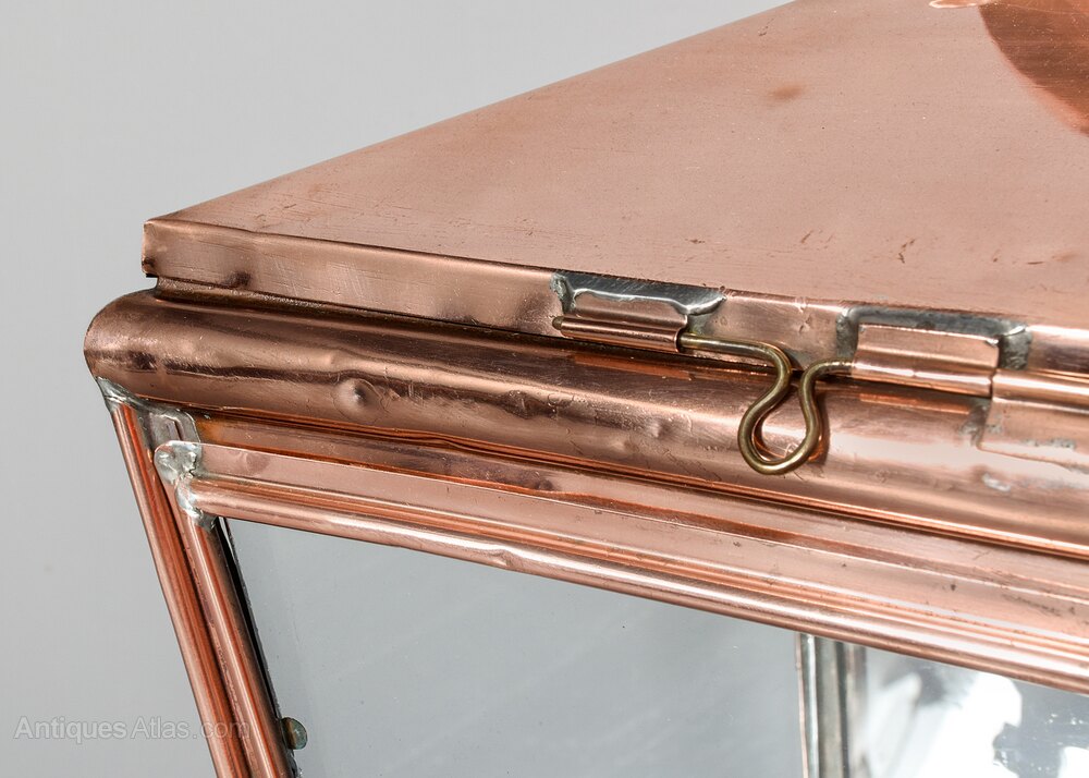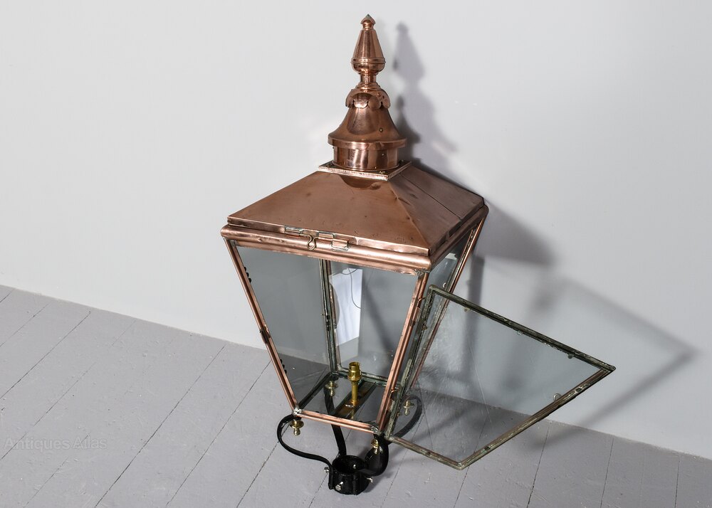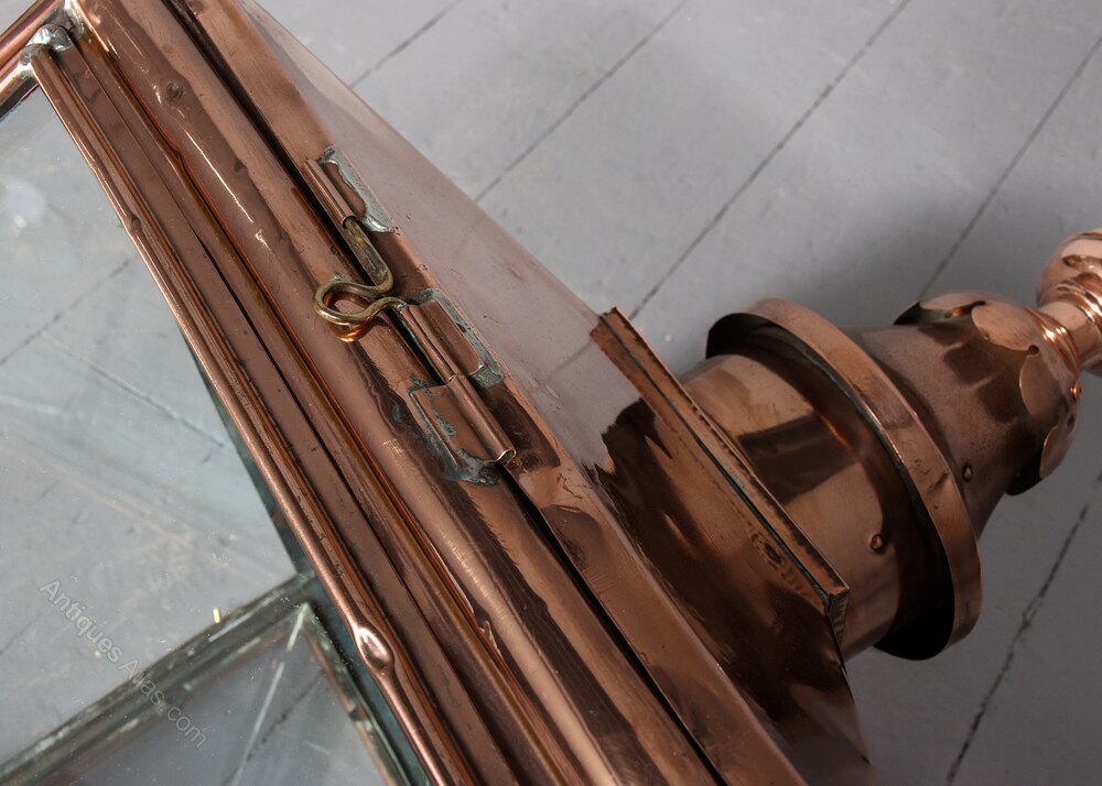 Circa 1840. An early Victorian copper and steel Lord Provost Edinburgh street light of typical tapering form, the stylish and elegant finial with a shaped base, the 4 glazed panels, one is hinged for accessing the lamp holder, supported on a cast iron base of four shaped arms locked in position by downward brass finials, recently cleaned and rewired for electricity.102cm High, 42cm Sq.