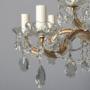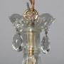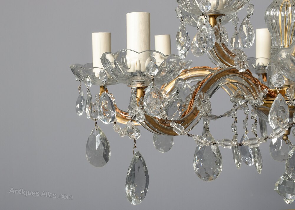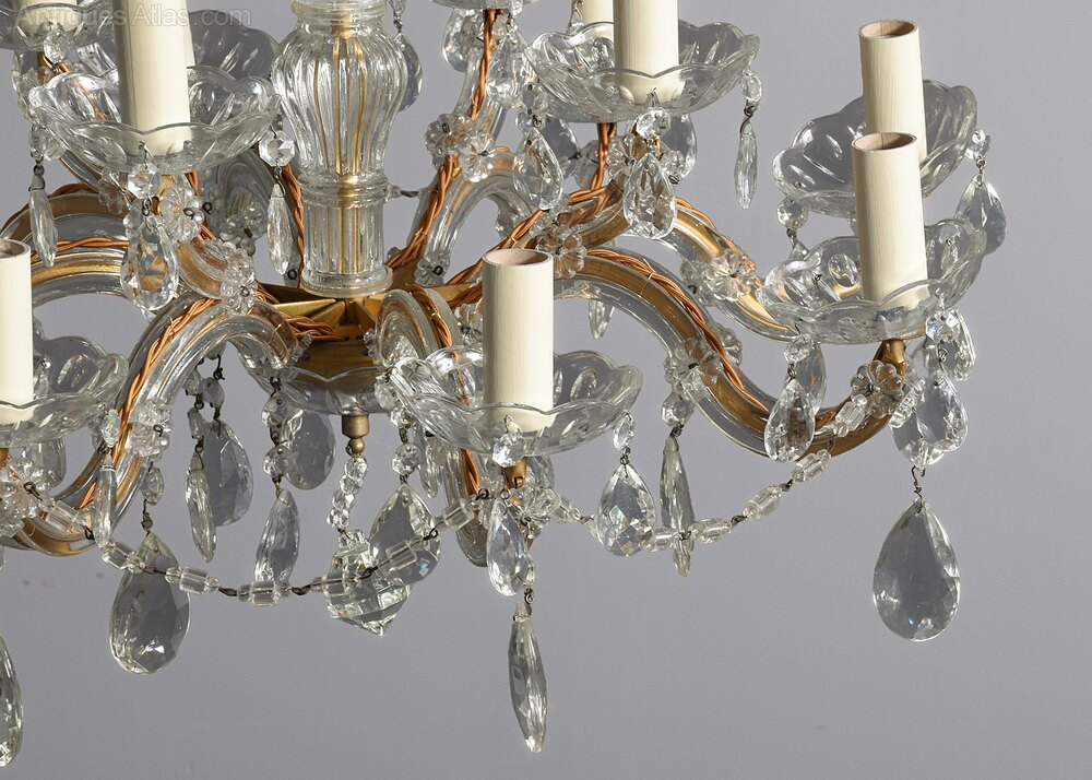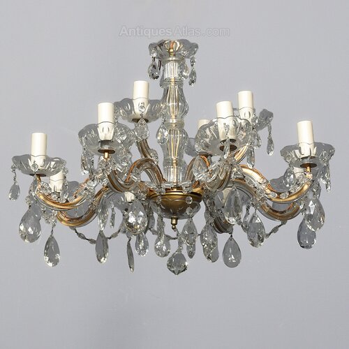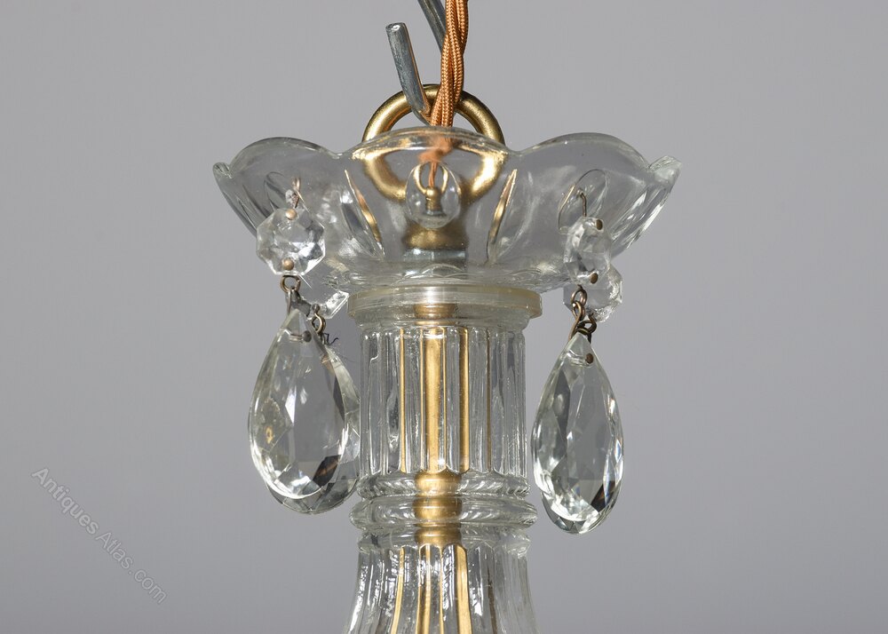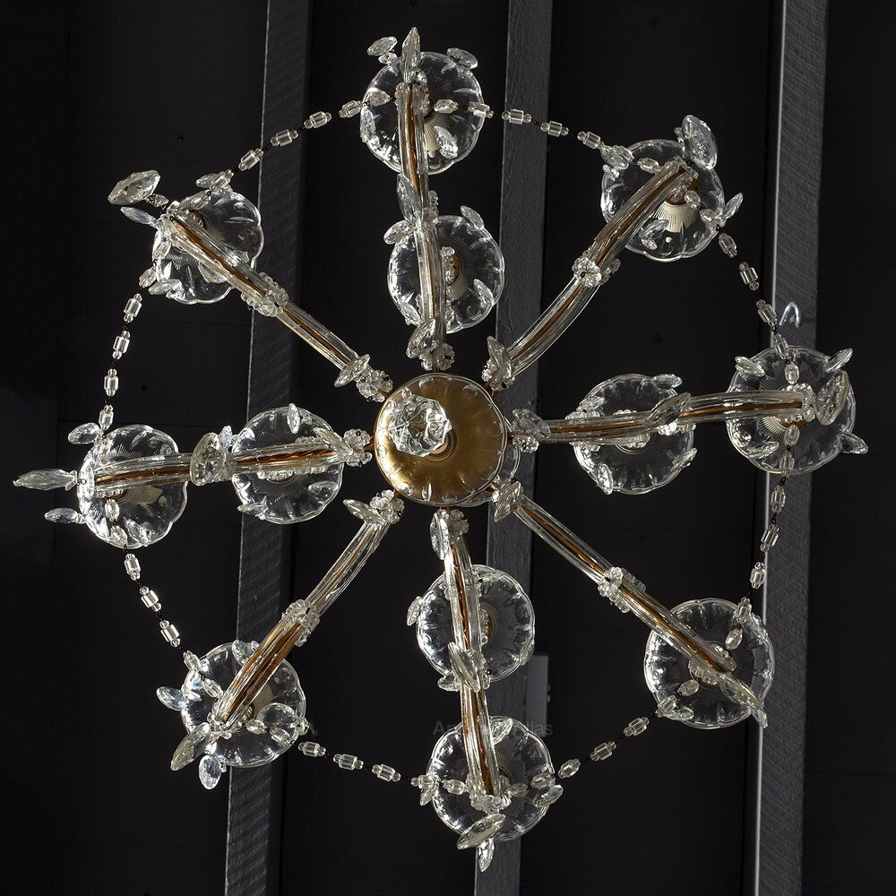 Circa 1930s. A stylish glass and crystal chandelier, the central stem with a flared top with downward-facing faceted crystal drops, the center stem is ribbed and issues 8 shaped arms, some with double lamp holders, each with glass flower heads on the facing an downward faceted oval crystal beneath, all of the external arms connected by trailing glass and glass finials. Recently rewired and PAT tested.50cm High, 65cm Dia.
