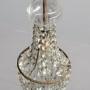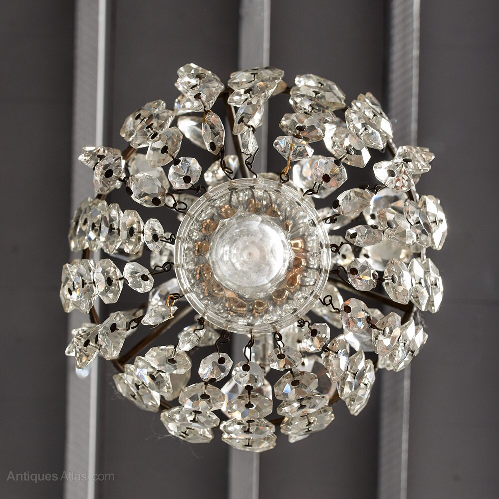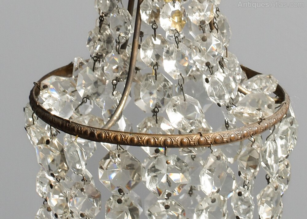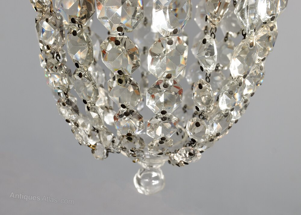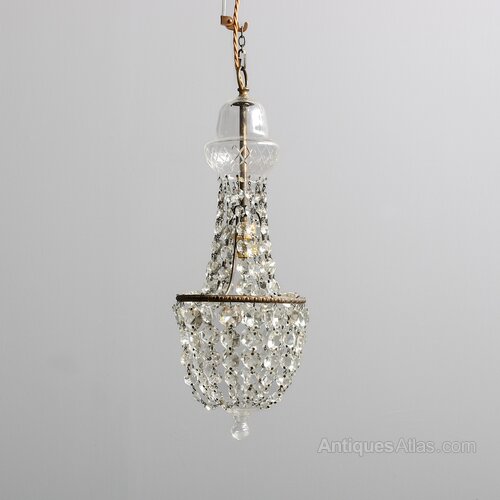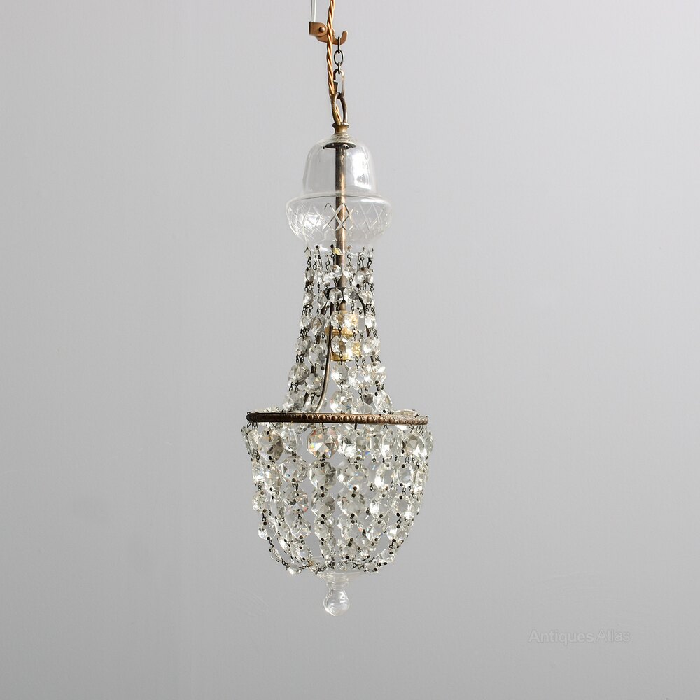 Circa 1920s. A diminutive glass and crystal French-style tent and waterfall single light chandelier, with a glass cap with etching on the facing, supporting strands of tapering faceted crystal, with a simple engraved bezel with tapering faceted crystals, finishing with a downward-facing glass finial. Recently rewired and PAT tested.49cm High, 17cm Dia.
