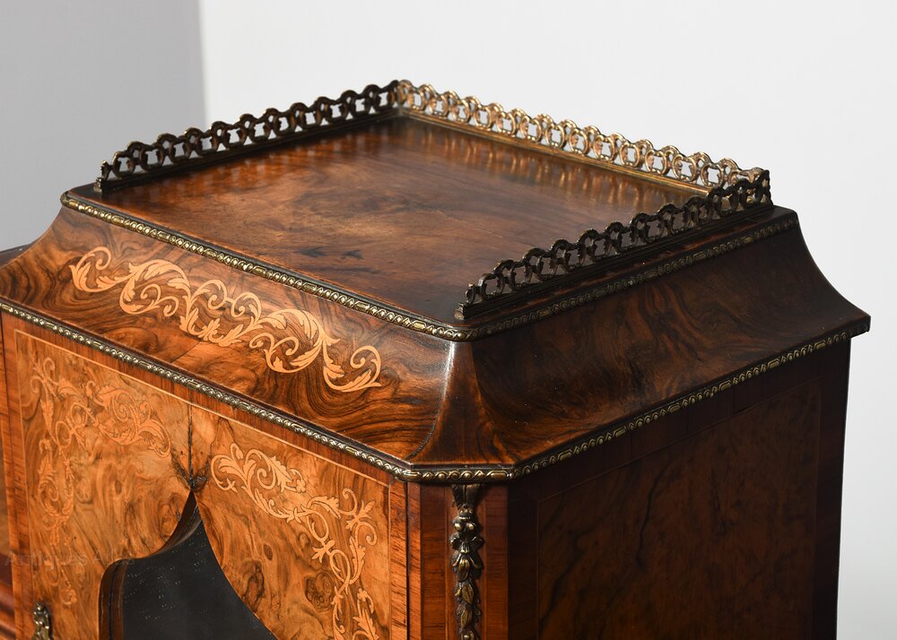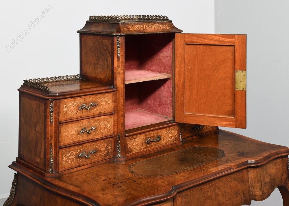 Circa 1860. Victorian marquetry-inlaid figured walnut ladies' writing desk (Bonheur de jour). The back with two of small drawers with rococo brass handles and seaweed foliate inlay, topped with open cast galleries. More centrally a cupboard with glazed door opening to shelved interior, with a brass gallery and brass mounts. The shaped green leather writing surface above a single frieze drawer. All supported on cabriole legs with cast brass capitals, sabots and brass mounts. In excellent condition with a nice colour and patina.92cm Wide, 62cm Deep, 71cm High to writing surface, 123cm max height