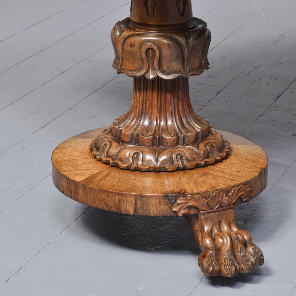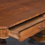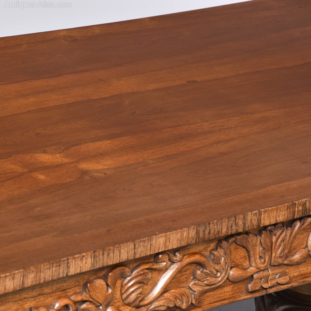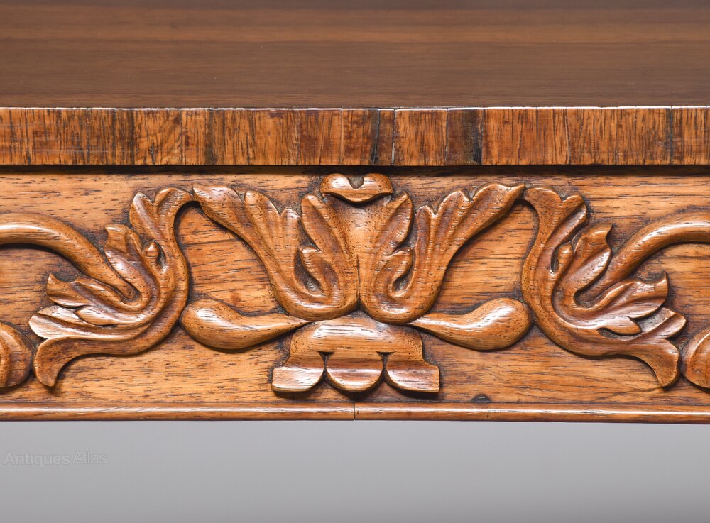 Circa 1830. Exceptional quality William IV freestanding rosewood library table. The rectangular top in figured Brazilian rosewood with cross banded fore-edges above two frieze drawers with relief foliate carvings and cedar drawer linings. The sides and the back with matching foliate carvings. All supported on two exceptional acanthus-carved, turned legs on circular platforms with further foliate carving over deeply carved lion claw feet with hidden brass casters.75cm High x 140cm Wide x 70cm Deep.