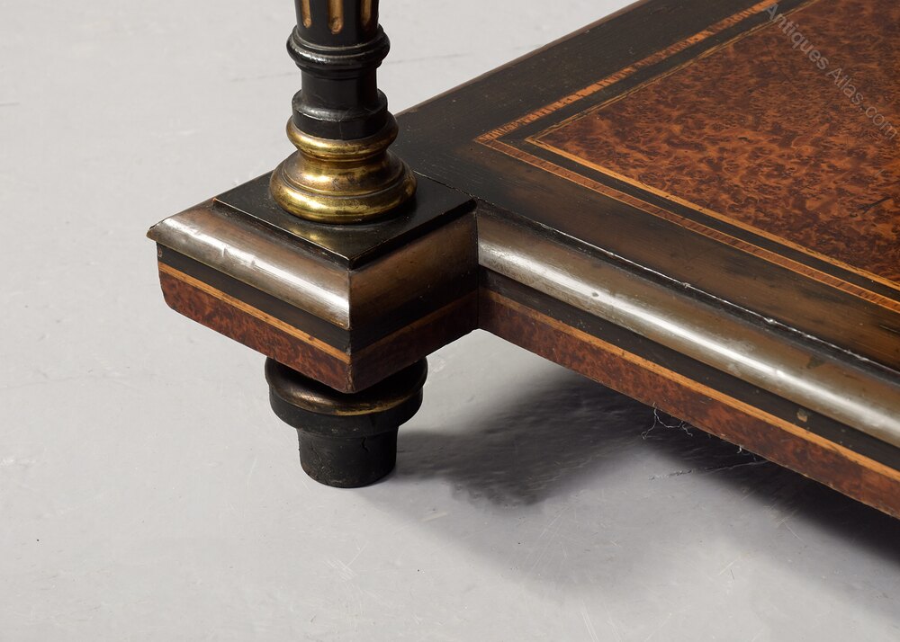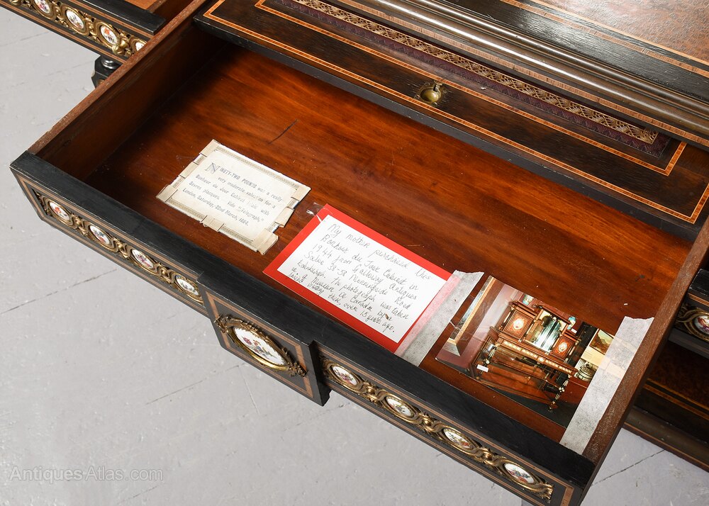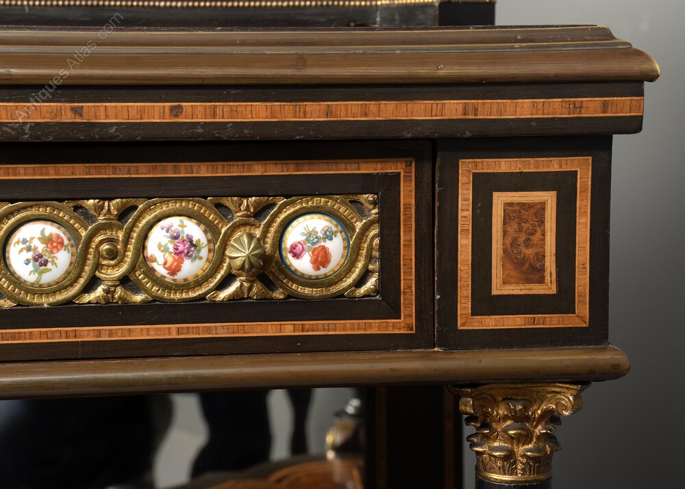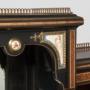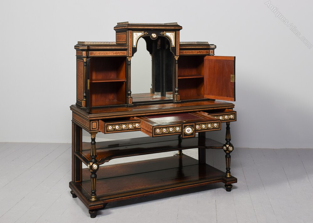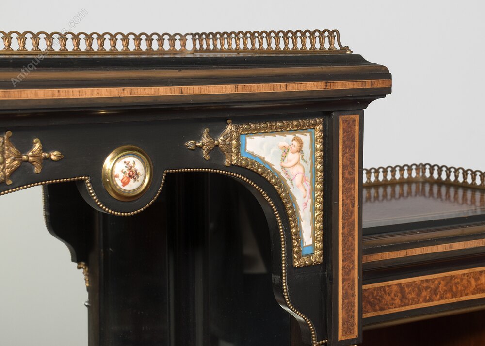 Circa 1860. A mid Victorian ebonized, porcelain and gilded metal mounted side cabinet, the breakfront top with pierced gallery, the central section with a mirror and recess, flanked by doors with three quarter brass galleries over mounted panels with Serves style porcelain plaques, all flanked by fluted and gilded columns with elegant capitals, the lower section with a moulded brass edge over three frieze drawers, the centre drawer with a leathered and tooled writing surface with a rinceaux frieze and further porcelain plaques, two mirror backed tiers flanked by fluted tapering supports, all raised on troupie feet152 cm H x 135 cm W x 55 cm D