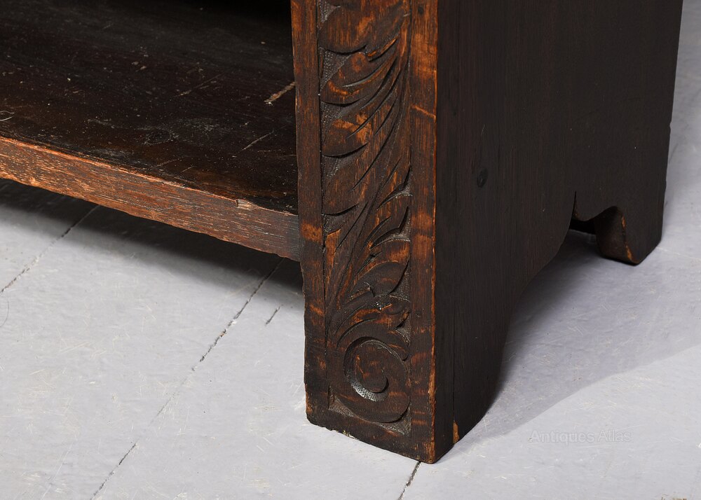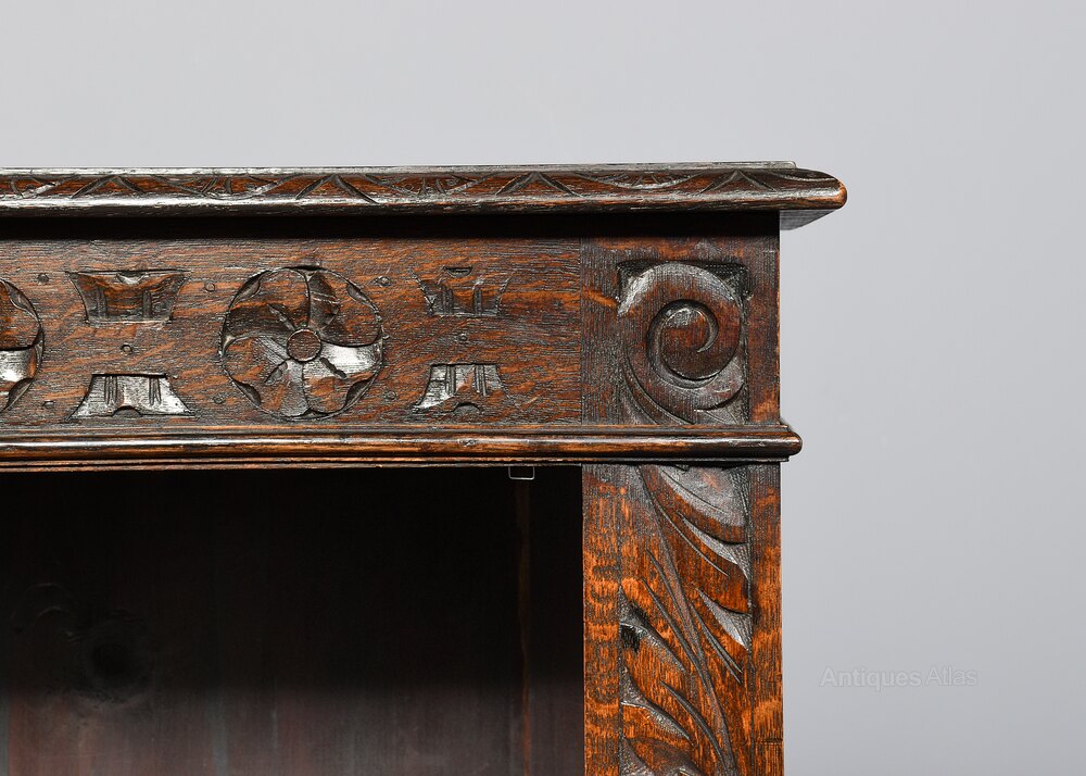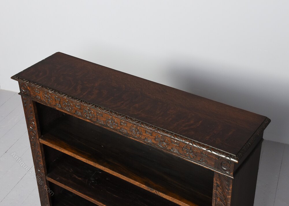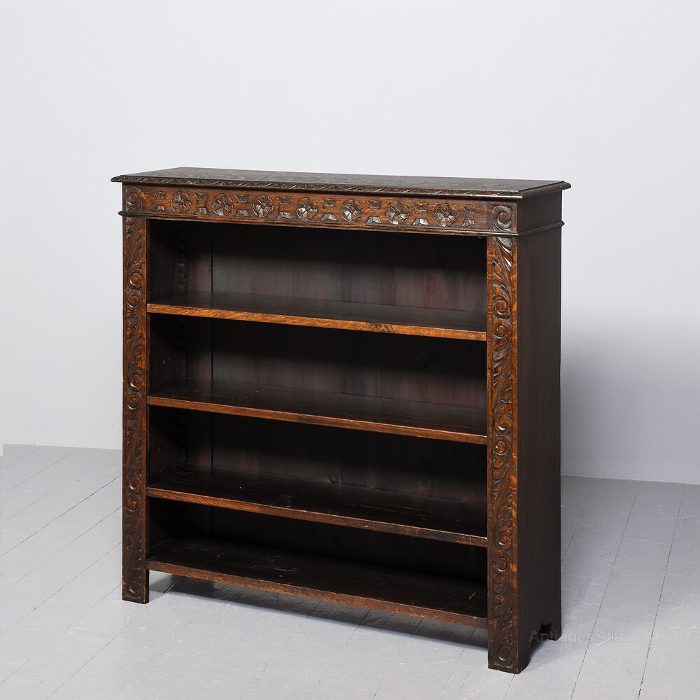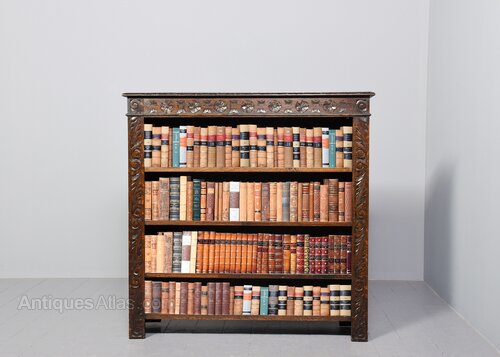 Circa 1870. Flemish carved oak, 19th-century open bookcase of desirable proportions. The rectangular top with a foliate carved fore-edge above a simple frieze. The bookcase with three oak-faced adjustable shelves flanked by foliate carved pilasters extending down as block feet.121 cm High x 123 cm Wide x 33 cm Diameter