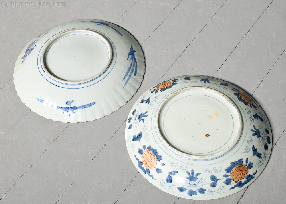Circa 1890. Two similar Meiji period Japanese Imari platters, one with a wavy edge and ribbing to the body, painted with the classic Imari colours of cobalt blue and red with small patterns throughout, the other with simple rim with painted panels including birds, flowers, and trees in mellow coloursAverage Dia. 46 cm.