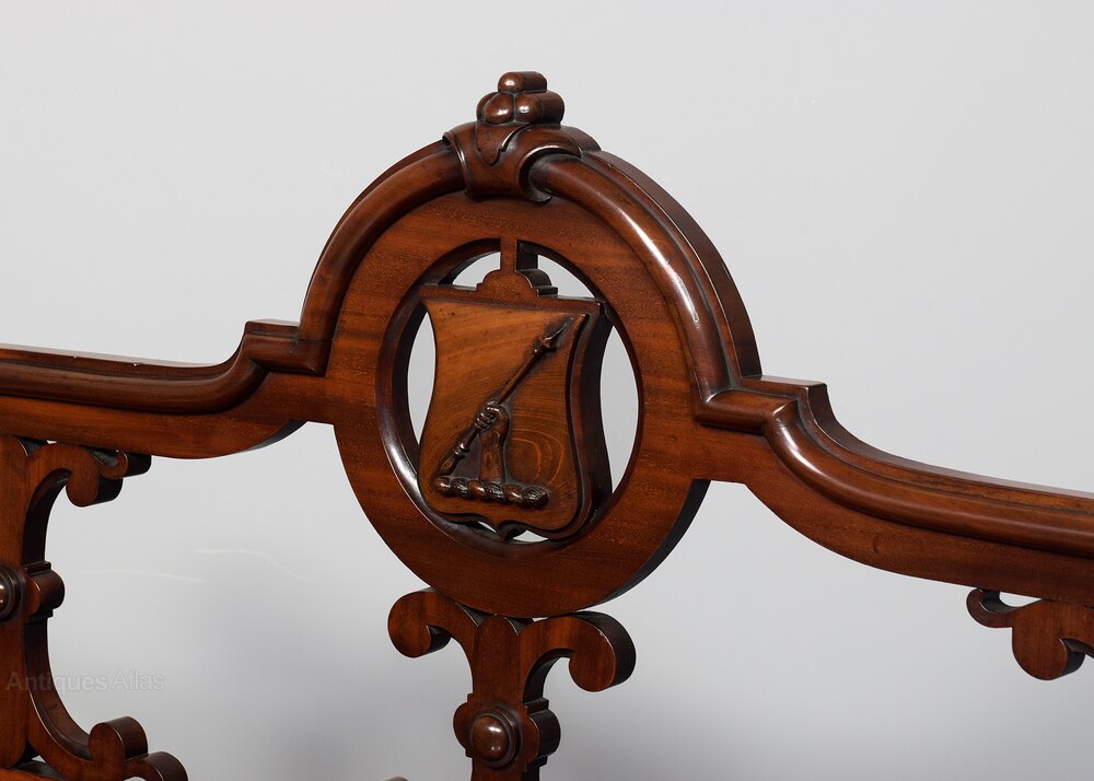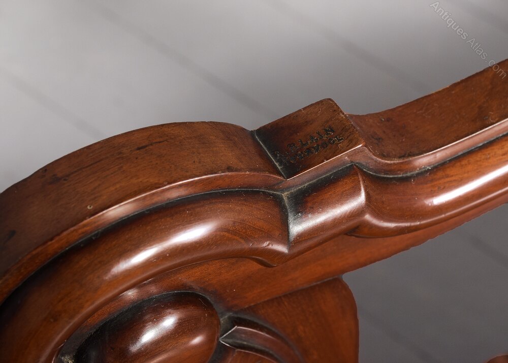 Arthur Blain established his cabinet making business in the William IV period at 35 Paradise Street, Liverpool. The earliest examples such as this exceptional bench are stamped with just A Blain Liverpool’ while later Victorian pieces carry the ‘A Blain & Sons’ . Arthur Blain died in 1868 when the business was continued by Arthur’s son William Hughes Blain who died in 1909. Their works were recorded in The Dictionary of English Furniture Makers, 1660-1840. Pieces by Blain are noted for the quality of the mahogany and walnut timbers used and exceptional hand craftsmanship and designs.