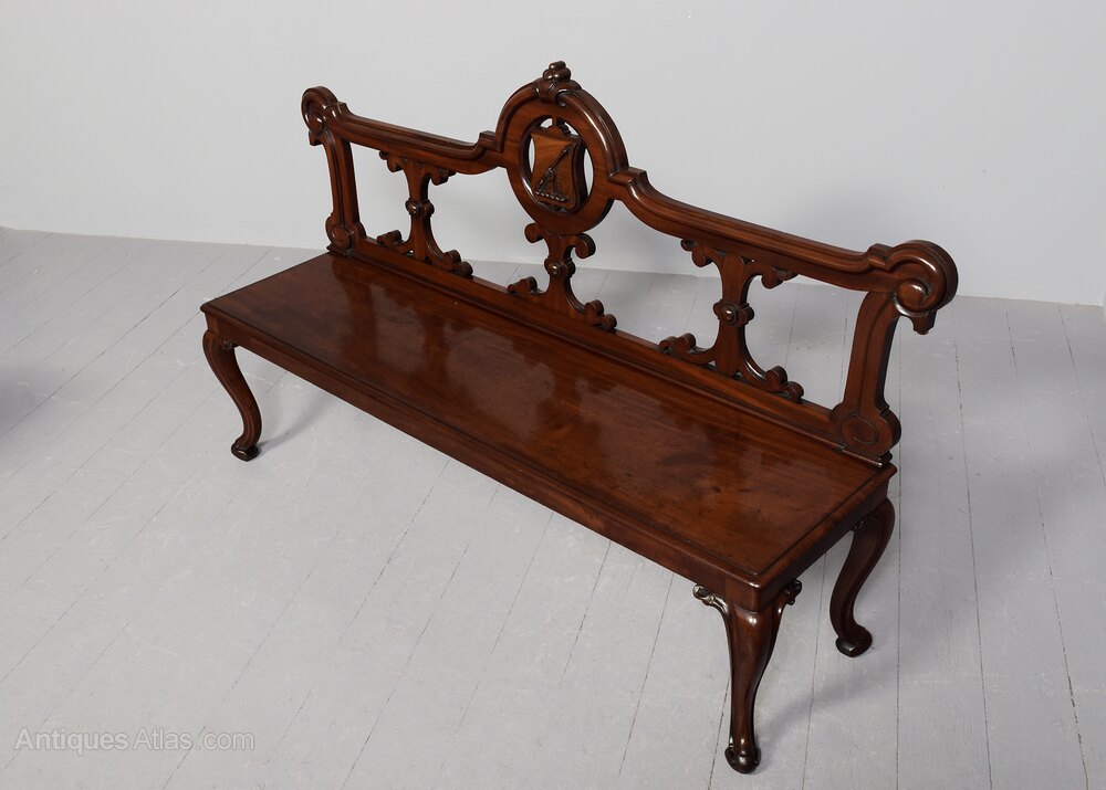 Circa 1840. Exceptional William IV carved mahogany hall bench, made by eminent Liverpool cabinetmakers Blain (stamped twice on back). The top rail with scrolled sides on three shaped foliate supports and a central circular plaque bearing a coat of arms of a hand holding a mace. The rectangular seat with moulded fore-edges supported on fluted cabriole legs with foliate quarter brackets and scrolled toes.162cm Wide, 97cm Tall, 43cm Deep