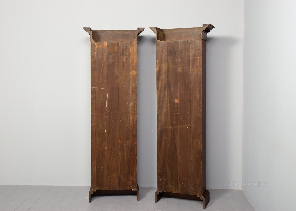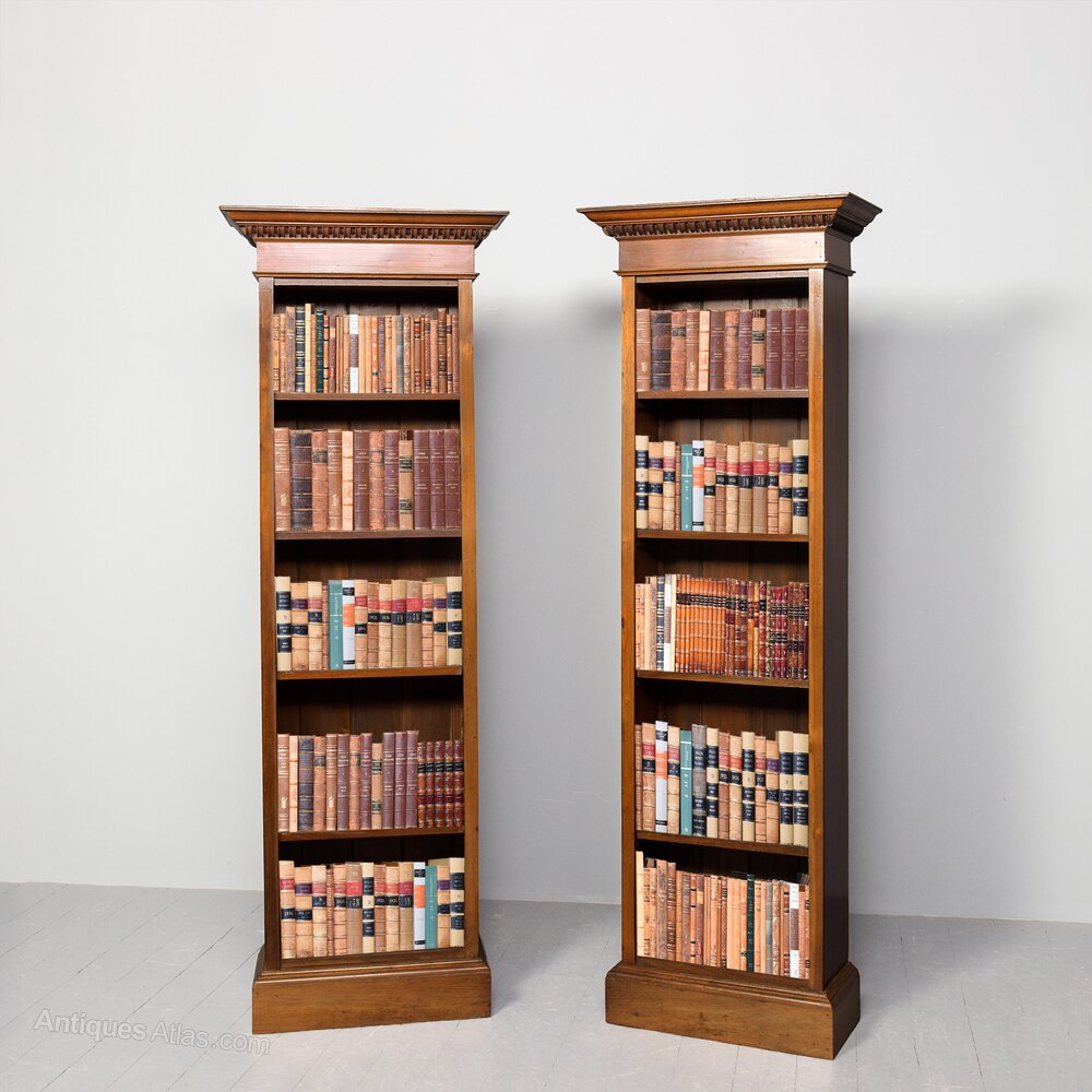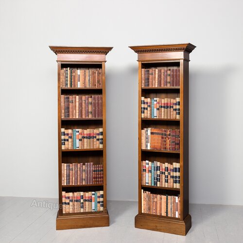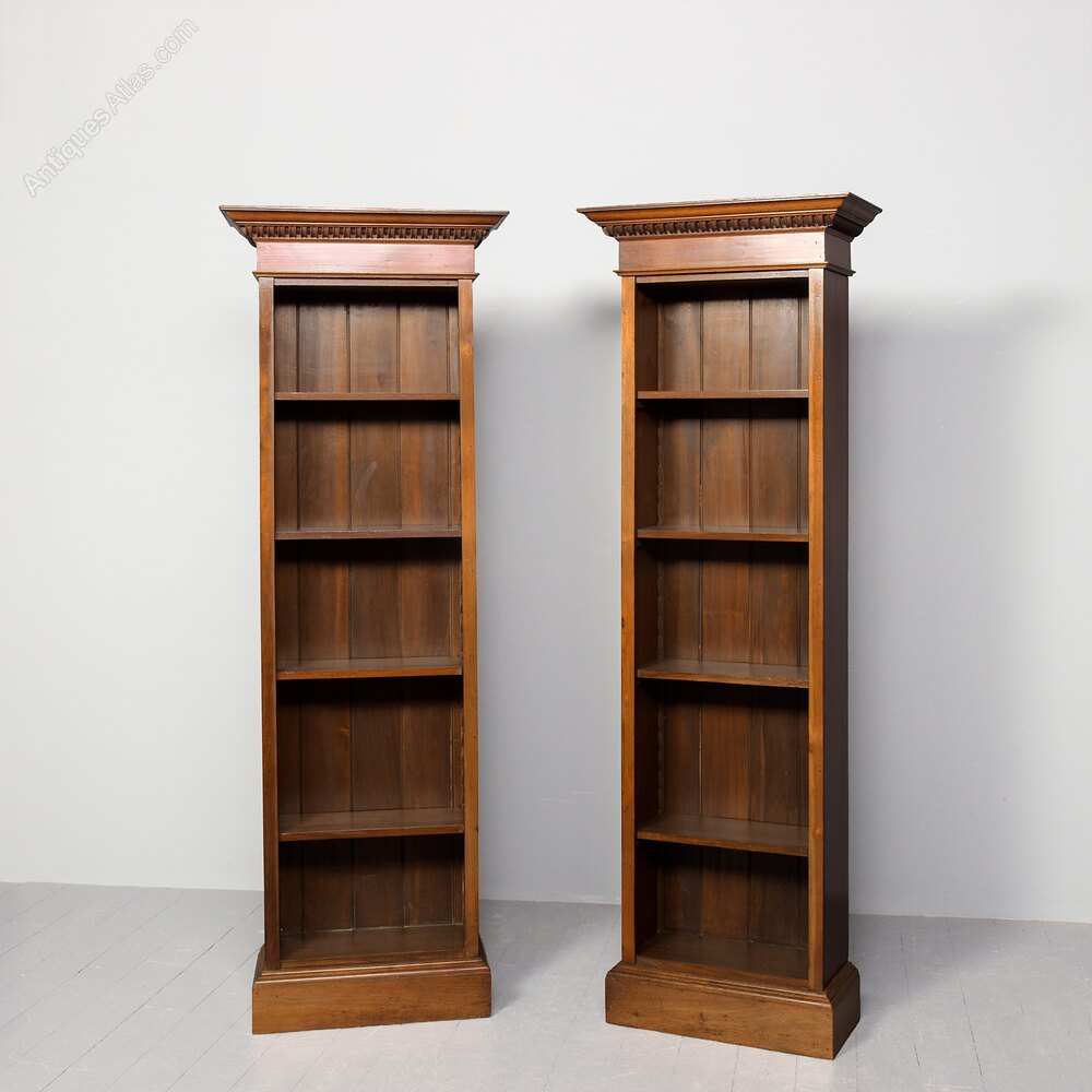Circa 1870 (with alterations). Pair of Victorian mahogany tall, slim 4-shelf open bookcases. Surmounted by classical moulded cornices and simple friezes, each bookcase with four adjustable shelves and flanked by simple pilasters and supported on moulded enclosed plinth bases. In excellent condition206 cm H x 65 cm W x 30 cm D
