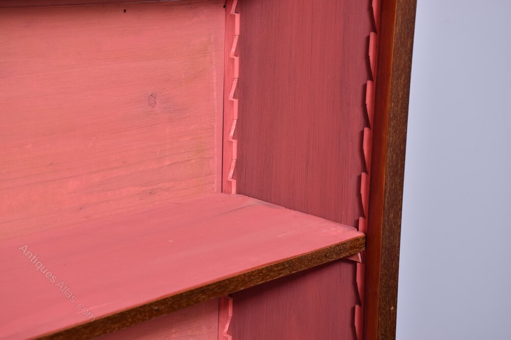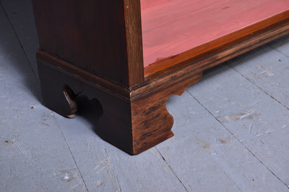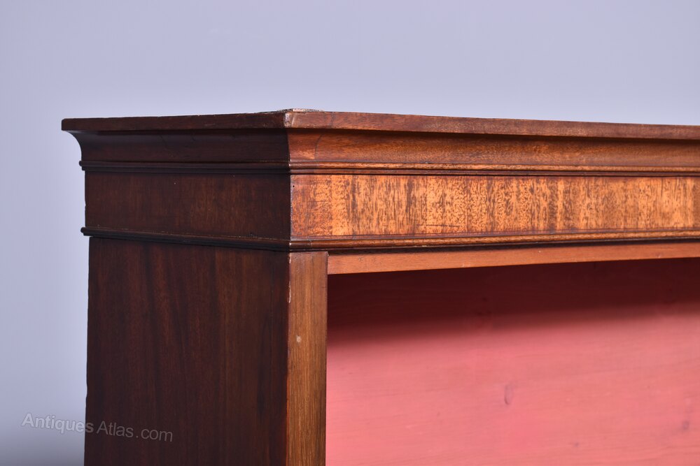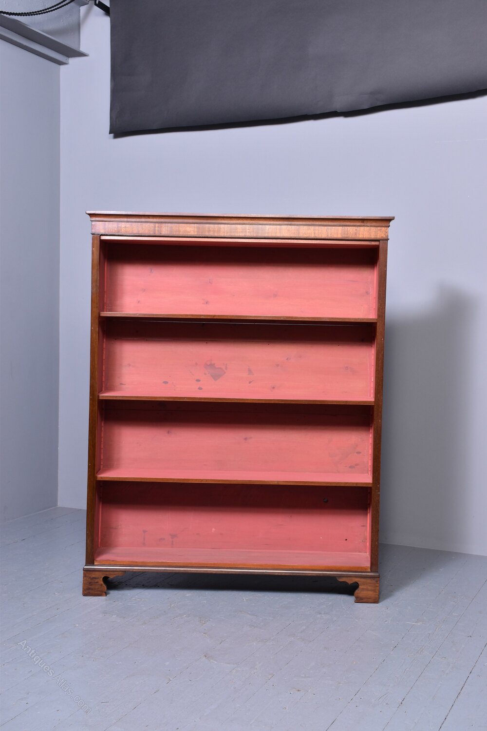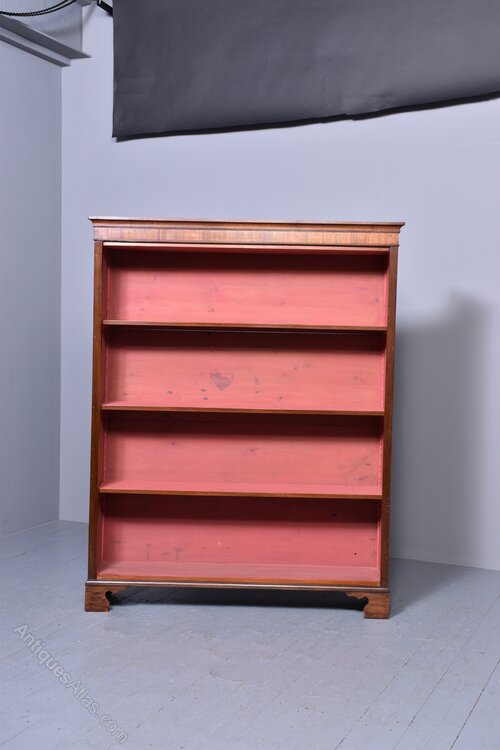 and a cross-banded frieze, the open bookcase with three adjustable shelves, flanked by simple pilasters. All supported on a moulded base and shaped bracket feet. In excellent condition. Simple and functional and would suit a contemporary or modern setting.166cm High, 132cm Wide, 30cm Deep