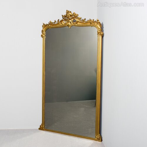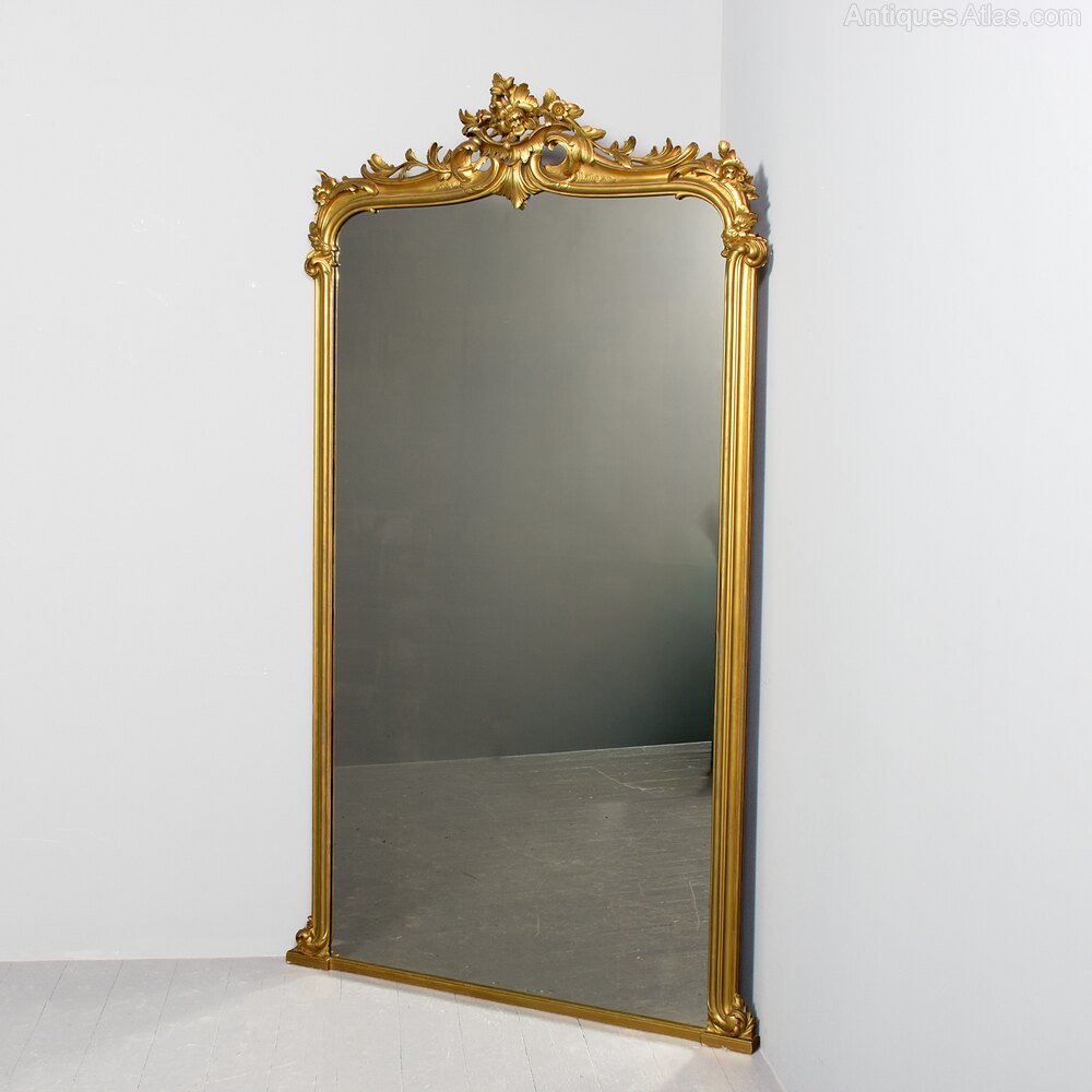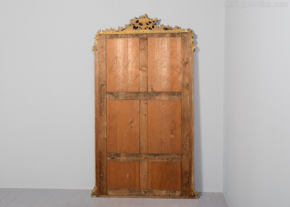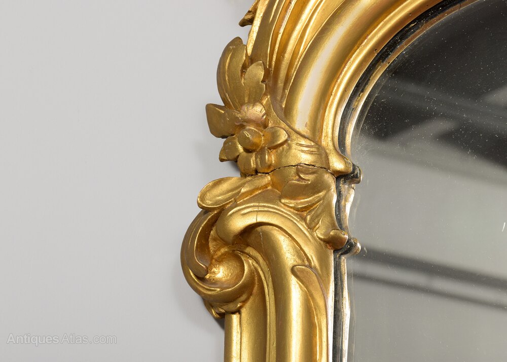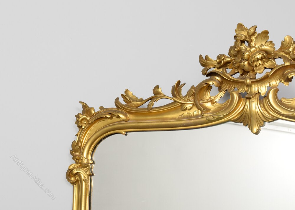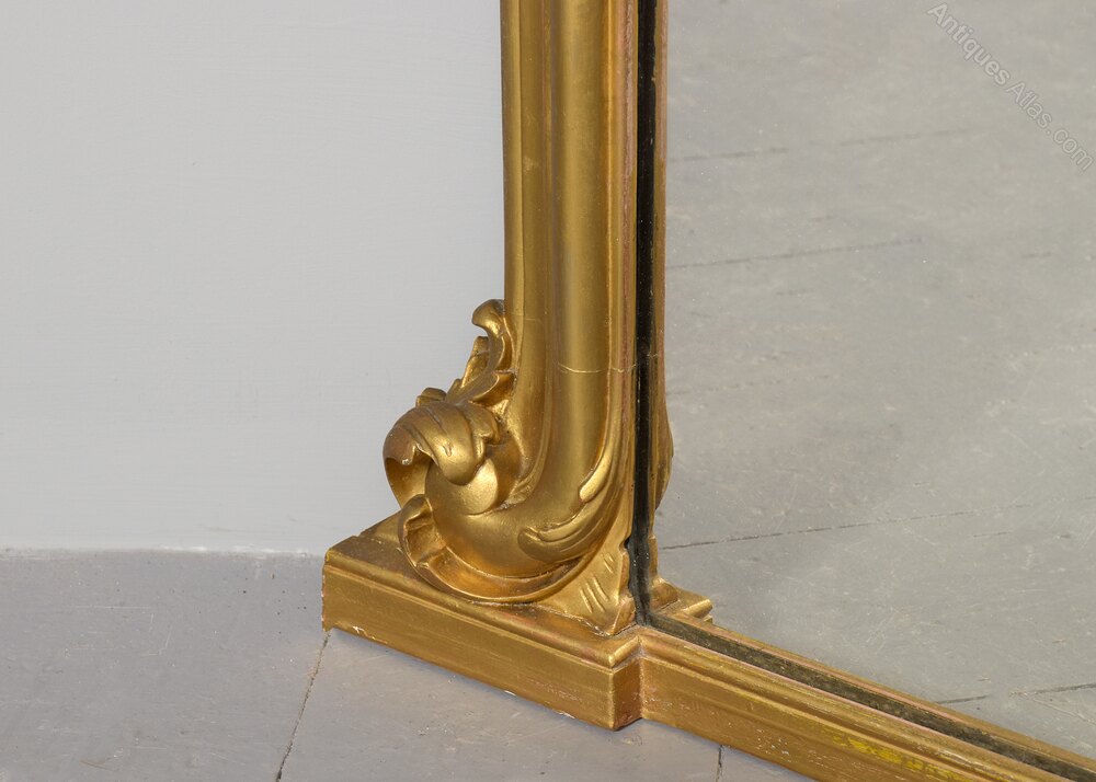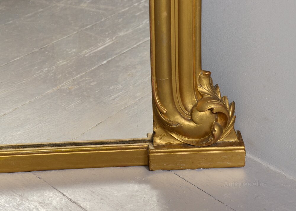 Circa 1860. Mid Victorian carved and gilded overmantel mirror, the top surmounted by a profusely carved and pierced foliate garland with asymmetric sections continuing onto the top and sides, all the facings with multiple mouldings with great colour and patination, the base with small foliate carving to the sides, resting on an enclosed gilded slip. The replaced mirror with no blemished whatsoever.235cm High, 130cm Wide