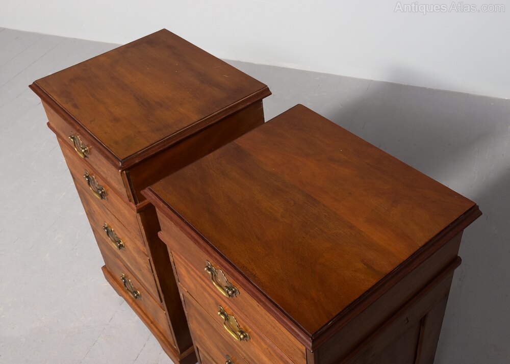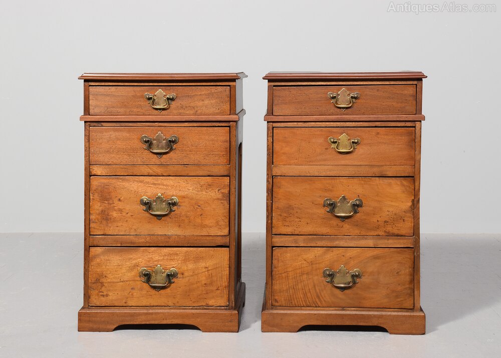 Circa 1850 with adaptations. Pair of Georgian-style. neat-sized chest of drawers/bedside lockers. The rectangular tops in nicely figured mahogany with a moulded fore edge above four graduated drawers with Georgia style cut brass handles and all supported on neat bracket feet.47cm Wide, 40cm Deep, 77cm Tall