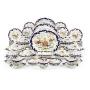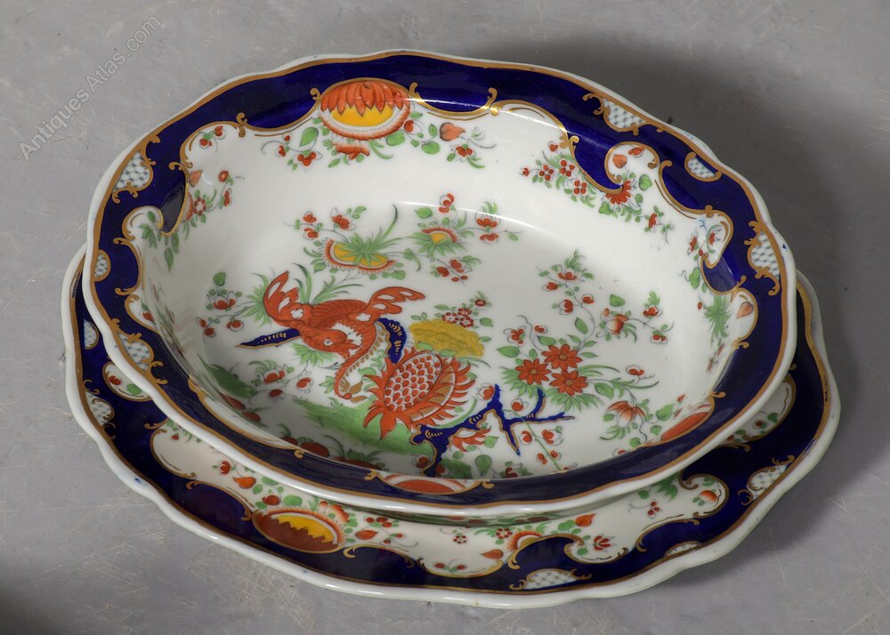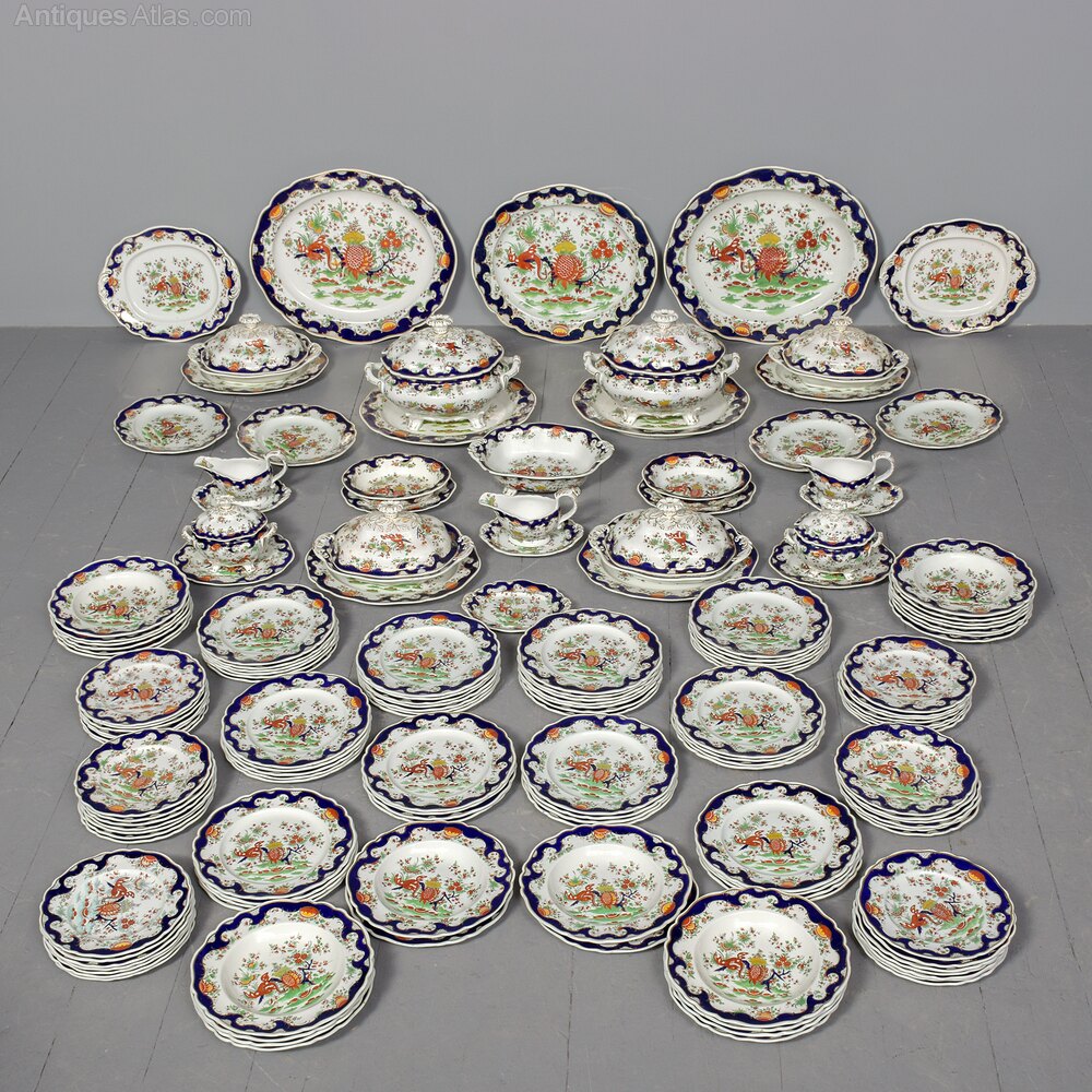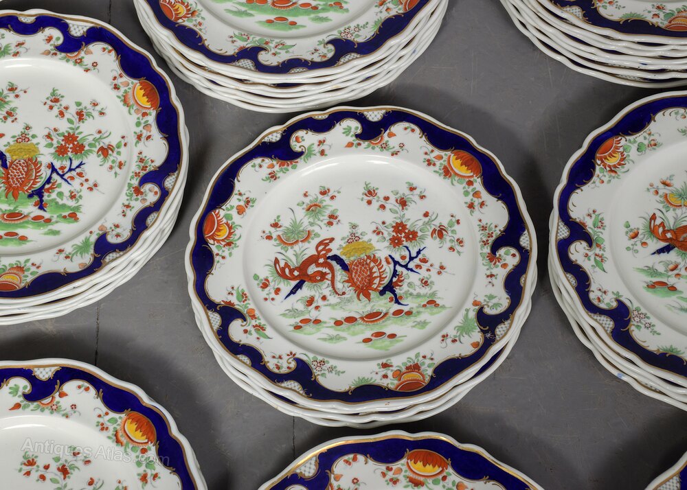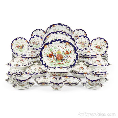 Circa 1800, the large dinner service by Chamberlains Worcester, in the Jabberwocky pattern, printed and enamelled decoration with gilt highlights comprising: fifty-two dinner plates, 26.5cm wide forty-one twiffler (medium sized) plates, 23cm diameter twenty-four shallow bowls, 26.5cm diameter two large tureens and covers on stands, tureens 36cm wide, 37.5cm wide fourvegetable tureens with covers, 33cm wide two small sauce tureens with covers and four stands, tureens 19.6cm wide, stands 22cm wide an oblong dish raised on four feet, 31cm wide two oval dishes, 23cm wide three sauce boats, 20cm wide seventeen graduated ashets of various sizes ranging from 25cm wide - 52cm wide some pieces are unmarked, some are impressed, some
