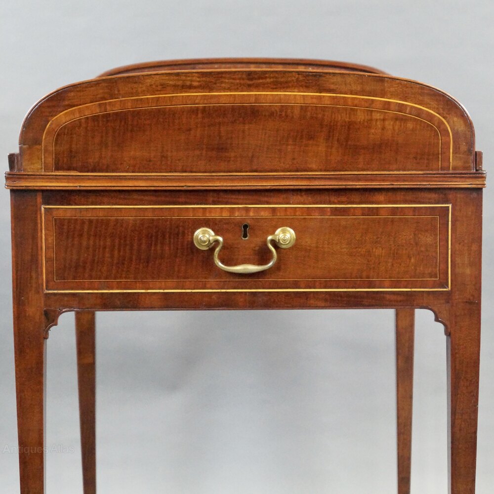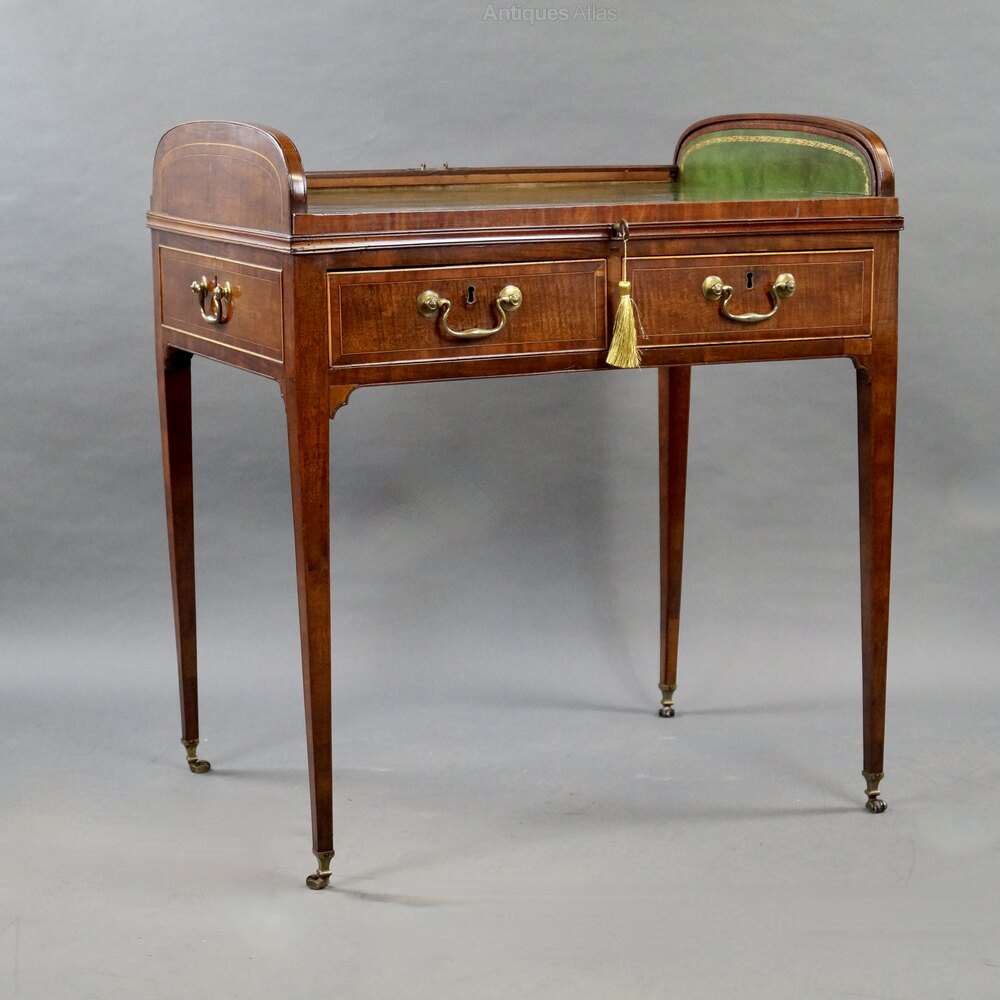 A rare George III tambour desk in mahogany and Lace-wood with boxwood stringing and cock-beading. Raised on fine square tapered legs terminating in brass castors with leather wheels. Above are two frieze drawers, with dummies to the ends and back, and the tambour top which opens to reveal a green leather interior. In good condition. 860mm high, 760mm wide and 570mm deep. English. Circa 1790.Provenance: Formerly retailed by W.R.Harvey & Co. Old Bond Street, Mayfair and thence into a private collection.