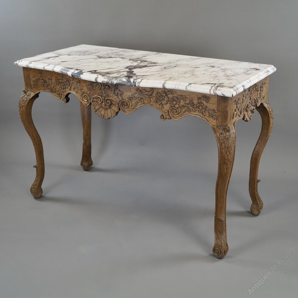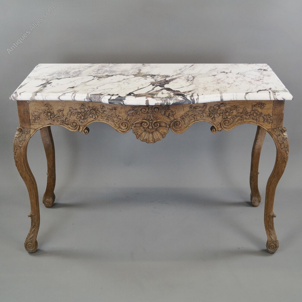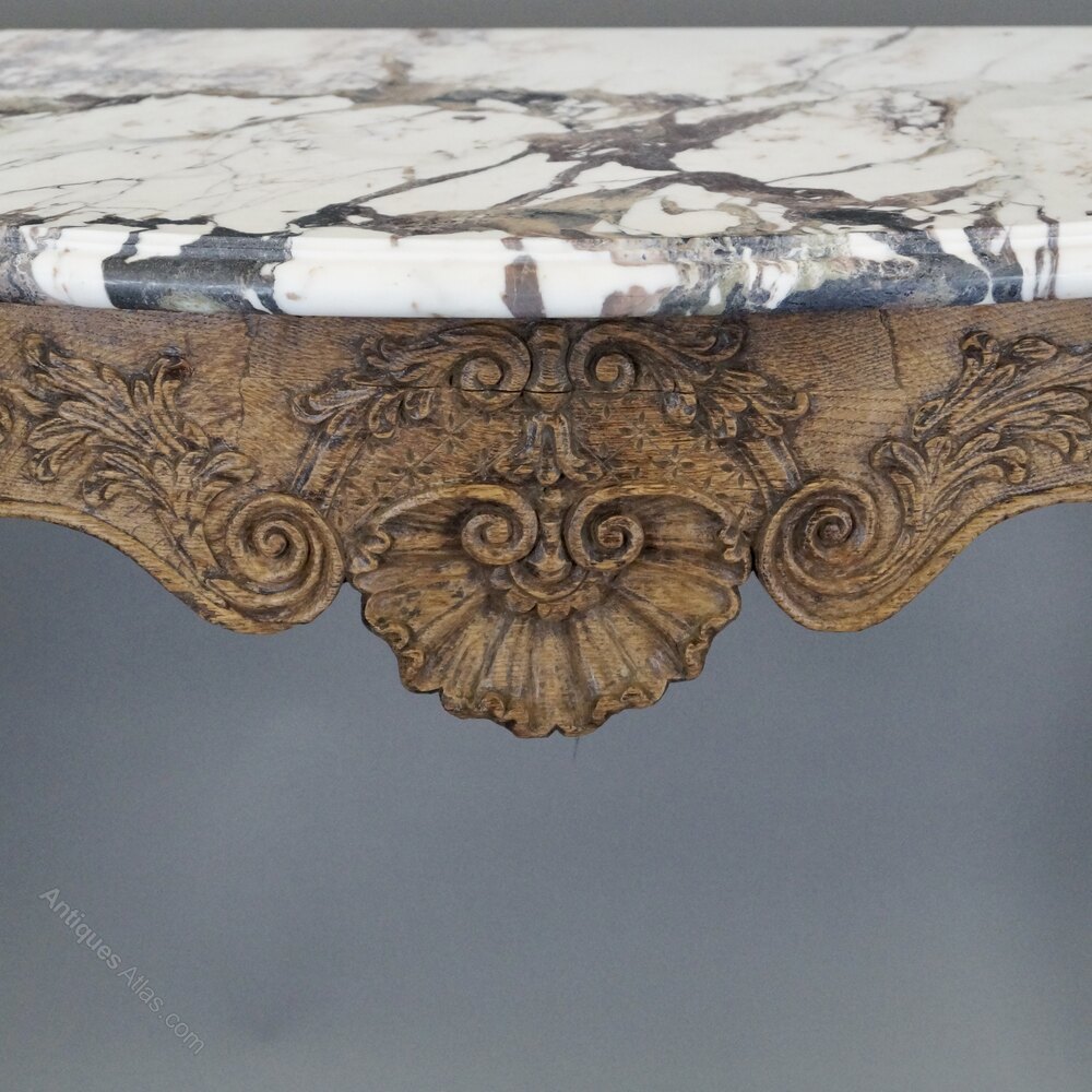 A late 18thC carved oak console. Raised on cabriole legs with carved knees and toes and above a serpentine frieze with shell and foliate carving. The console is topped with a later Arabescato marble. 770 mm high, 1150mm wide and 570mm deep. In good and original condition. Flemish. Circa 1780.W J Gravener Antiques is a family owned business, started in 1963 by William who was joined by son, Mark in 1981 and continues today with the same ethos of dealing in fine quality English and Continental furniture, mirrors and decorative objects, from the 18th & 19th centuries. Now under the stewardship of Mark and his wife, Louise, we take pride in maintaining the high standards which William set more than 50 years ago.