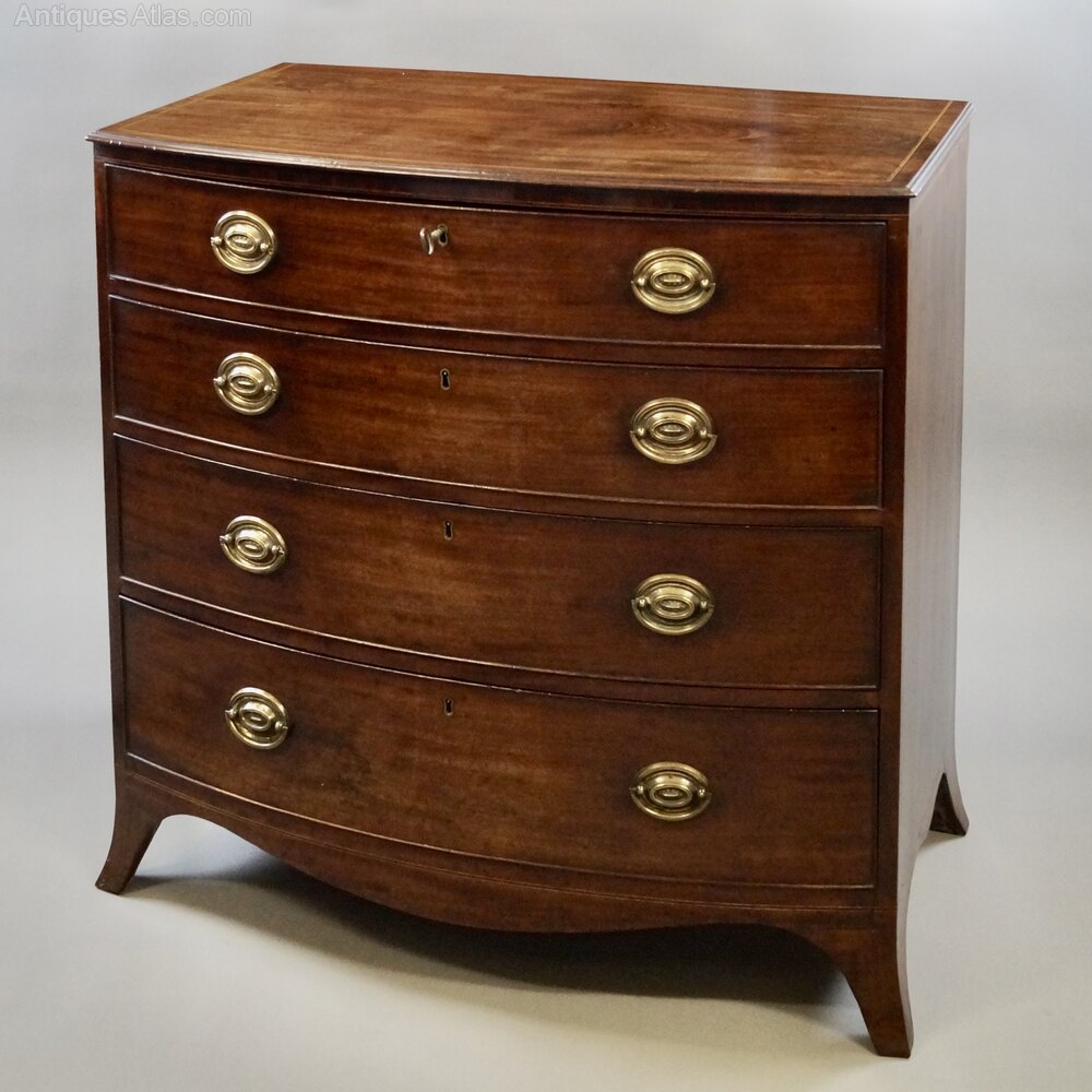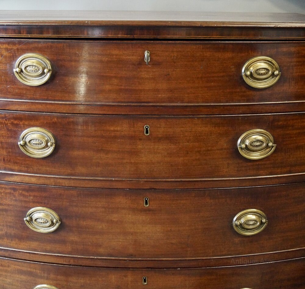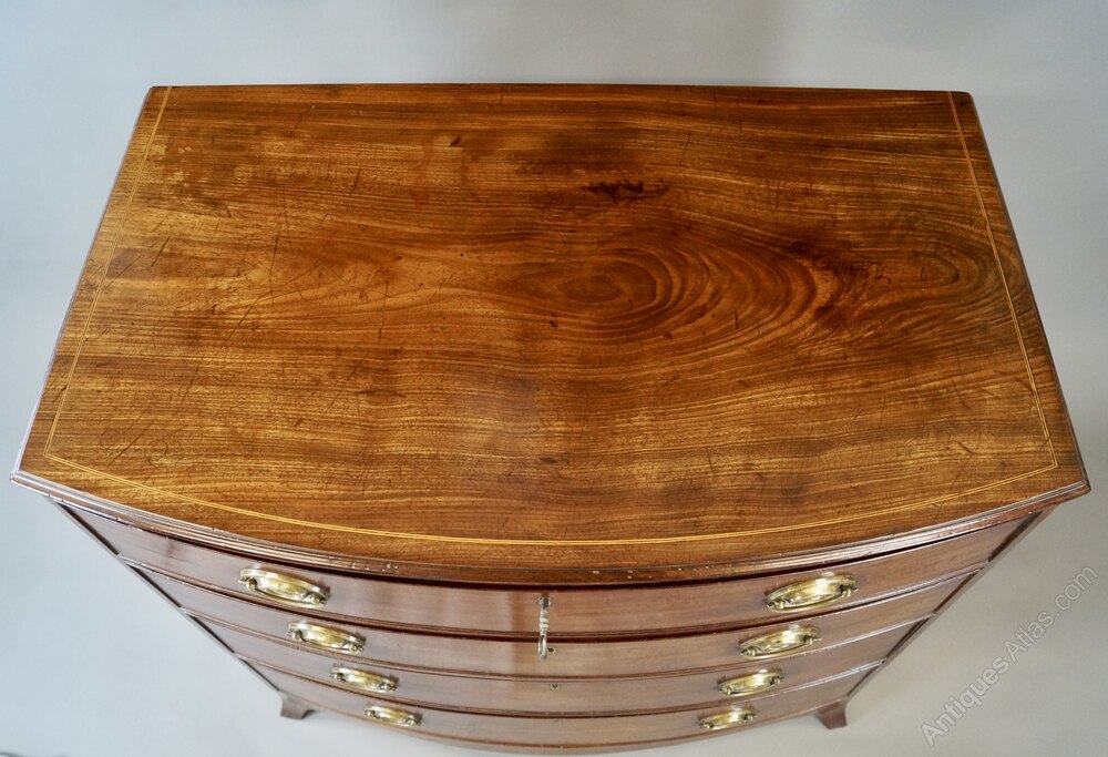 A superior quality George III period mahogany bow-fronted chest. The well figured top inlaid with boxwood and ebony line. The four oak-lined drawers fitted with the original brass handles and original locks. In very good original condition throughout and retains a great surface and colour. 920mm high, 930mm wide and 570mm deep. English. Circa 1810.W J Gravener Antiques is a family owned business, started in 1963 by William who was joined by son, Mark in 1981 and continues today with the same ethos of dealing in fine quality English and Continental furniture, mirrors and decorative objects, from the 18th & 19th centuries. Now under the stewardship of Mark and his wife, Louise, we take pride in maintaining the high standards which William set more than 50 years ago.