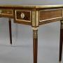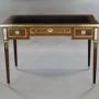 A fine English bureau plat. In quality mahogany and raised on turned and fluted legs with brass cap feet and foliate adornments. Above are three, oak lined, frieze drawers and a banded top, with inset black leather writing surface, all with cast brass moldings. The table is finished all around meaning it is a " stand alone piece". In very good and original condition and bearing the makers stamp "C. Mellier" on the underside. 760mm high, 1070mm wide and 590mm deep. English. Circa 1885.Charles Mellier was first listed in London directories as an upholsterer at 2 Frith Street, Soho in 1870. This address was a shop established in 1861 by Georges-Alphonse Monbro (1807-84), the renowned Parisian cabinet maker. It has been said that Mellier bought the London shop on his death changing the business name to his own but a 1927 advertisement stated that the Mellier business was established in 1865.