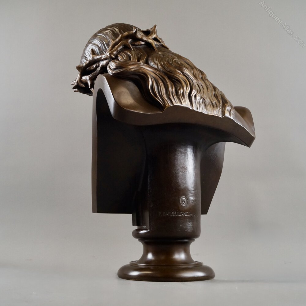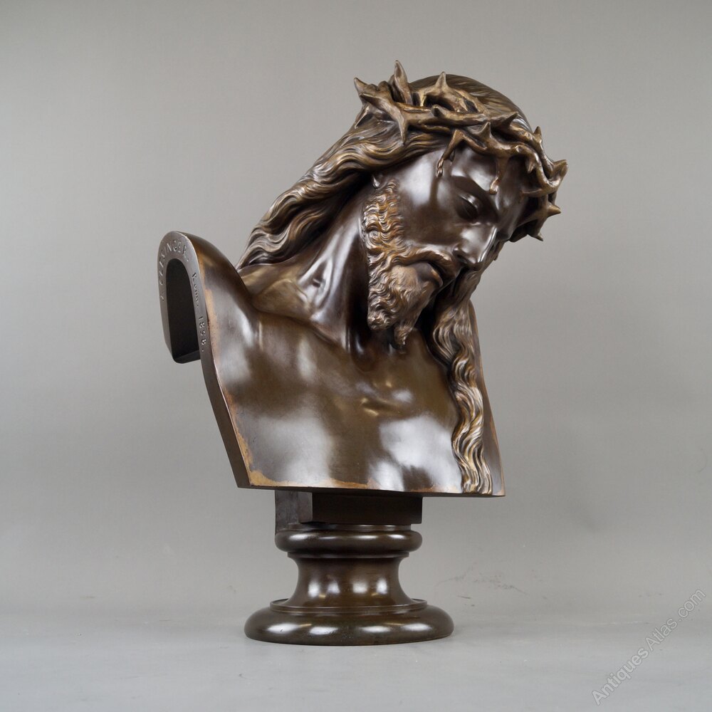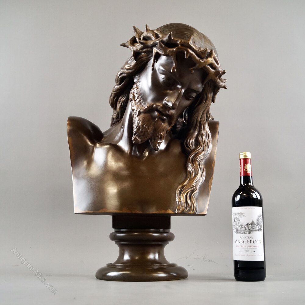 A very large, life size, French Patinated Bronze Bust of Jesus Christ, Signed J. Clesinger, Rome 1858 & F. Barbedienne Fondeur. 660mm high, 460mm wide and 380mm deep.Jean-Baptiste Clésinger (FRENCH, 1814-1883)
