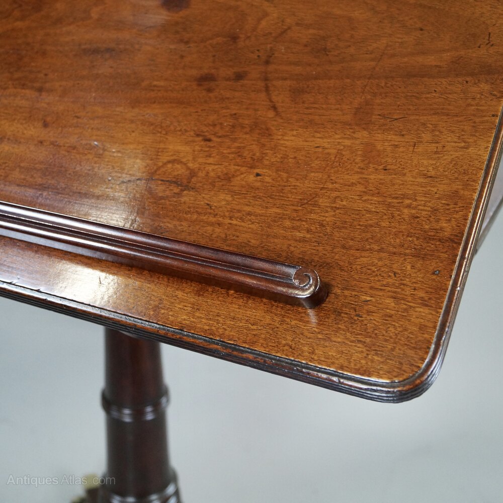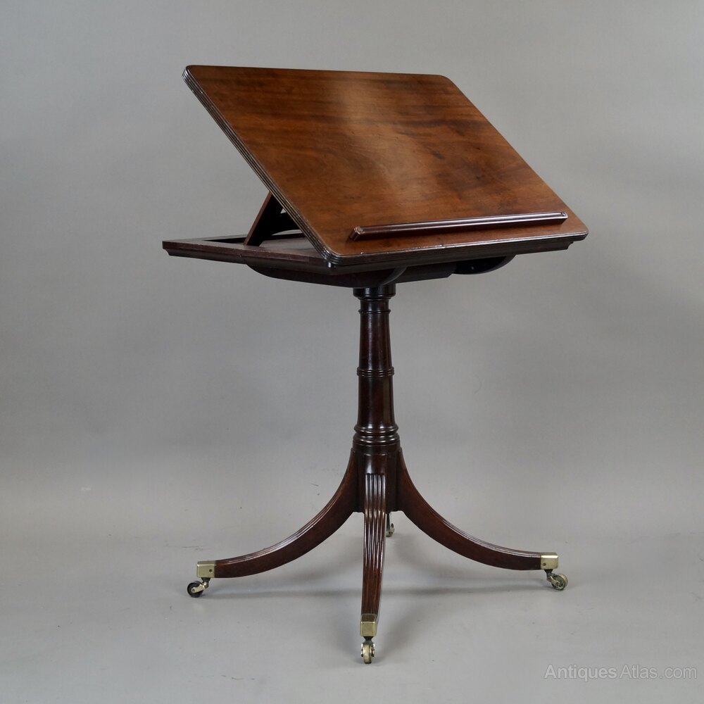 George III, Cuban mahogany reading table. Raised on reeded splay legs which terminate in brass castors and with a turned column. The top has a ratchet adjustment and removable book rest. The whole is in dense Cuban mahogany which retains a good colour and waxed patina. In very good and original condition. 730mm high, 700mm wide and 500mm deep. English. Circa 1780.W J Gravener Antiques is a family owned business, started in 1963 by William who was joined by son, Mark in 1981 and continues today with the same ethos of dealing in fine quality English and Continental furniture, mirrors and decorative objects, from the 18th & 19th centuries. Now under the stewardship of Mark and his wife, Louise, we take pride in maintaining the high standards which William set more than 50 years ago.