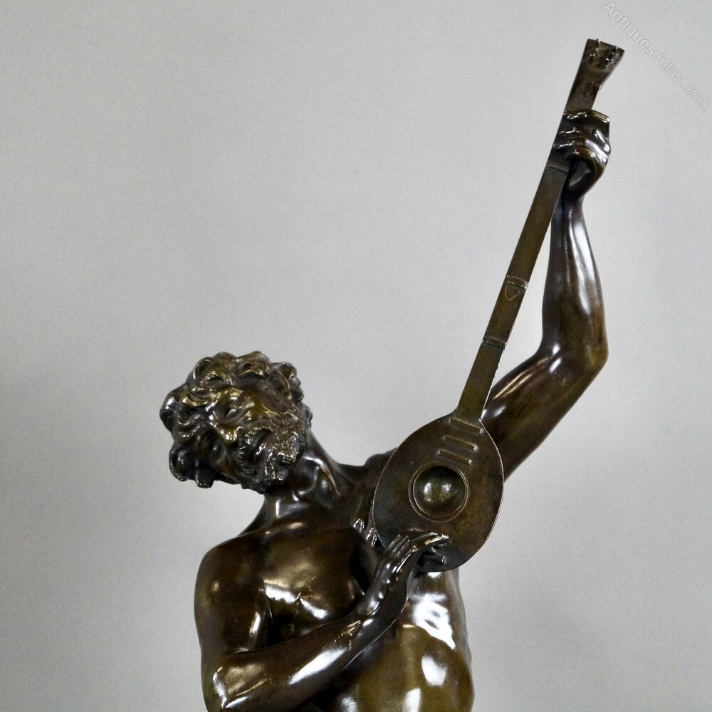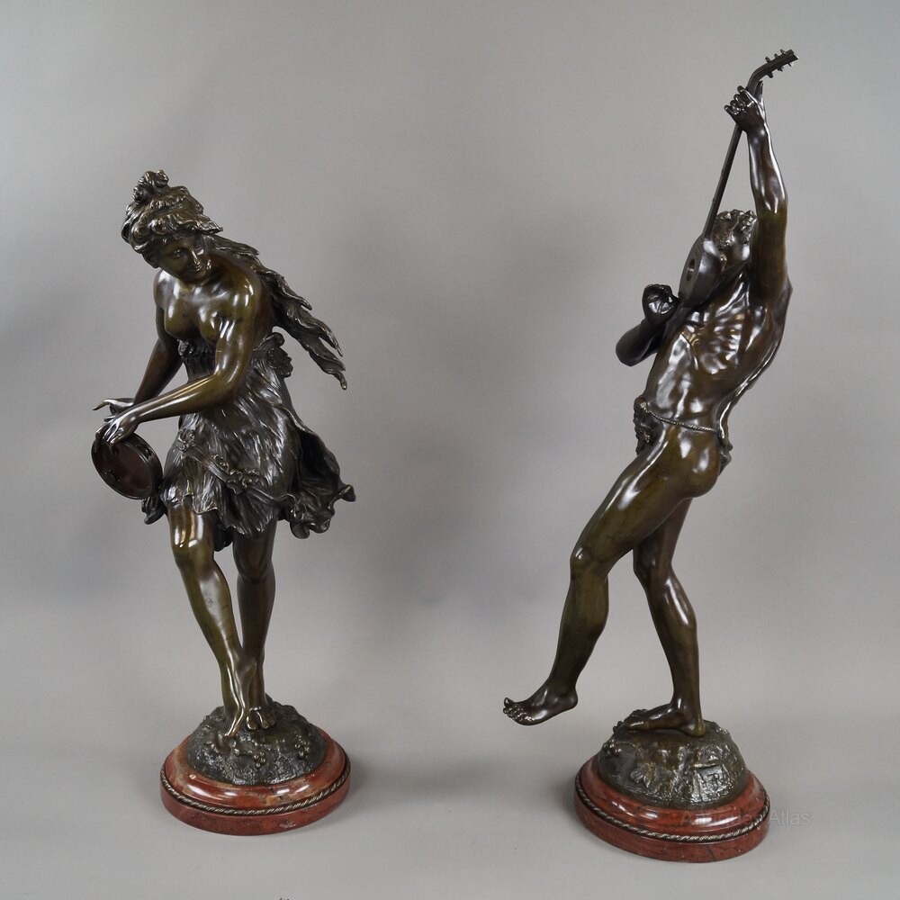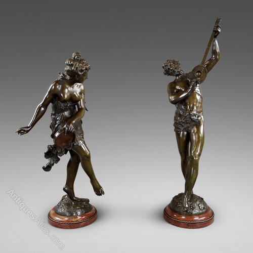 A pair of bronze figures of dancing musicians by Victor Rousseau (Belgium, b. 1865).The male figure playing a mandolin, the female figure dancing and holding a tambourine, both raised on circular naturalistic bases cast with grapes and vine leaves, signed ROUSSEAU, greenish patination, raised on circular brèche rouge marble plinths. 830mm high, 330mm wide and 310mm deep. Belgium. Circa 1910.