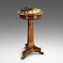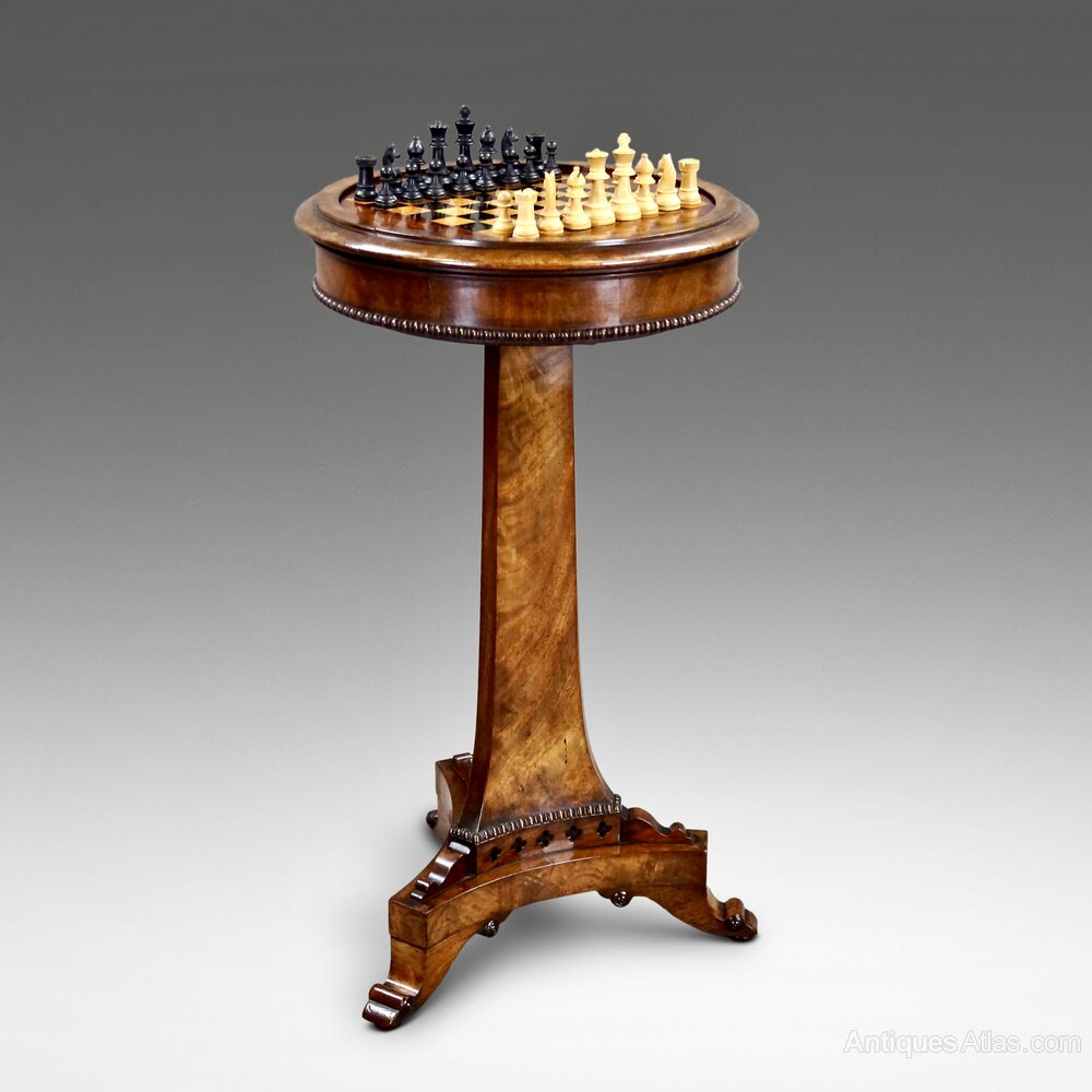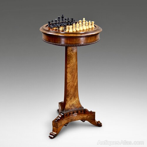 A William IV chess table. In flame mahogany and raised on shaped feet with a triform base and similarly shaped column. The circular top with a lift out chess board to allow for the storage of Chess and Draughts pieces. In very good and original condition and with a lovely colour. 740mm high and 410mm diameter. English. Circa 1835.N.B. Chess set not included.