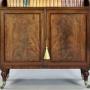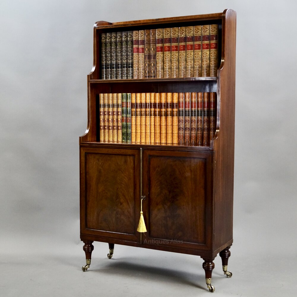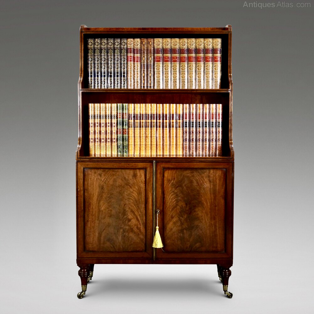 A Fine George III Mahogany Waterfall Bookcase. Raised on turned legs with original brass castors and above, cupboard doors, with flame mahogany panels, enclosing a shelved interior. The top has graduated shelving and the whole is in very good and original condition with a superior colour and waxed patina. 1220mm high, 680mm wide and 270mm deep. English. Circa 1815.W J Gravener Antiques is a family owned business, started in 1963 by William who was joined by son, Mark in 1981 and continues today with the same ethos of dealing in fine quality English and Continental furniture, mirrors and decorative objects, from the 18th & 19th centuries. Now under the stewardship of Mark and his wife, Louise, we take pride in maintaining the high standards which William set more than 50 years ago.