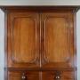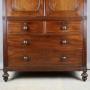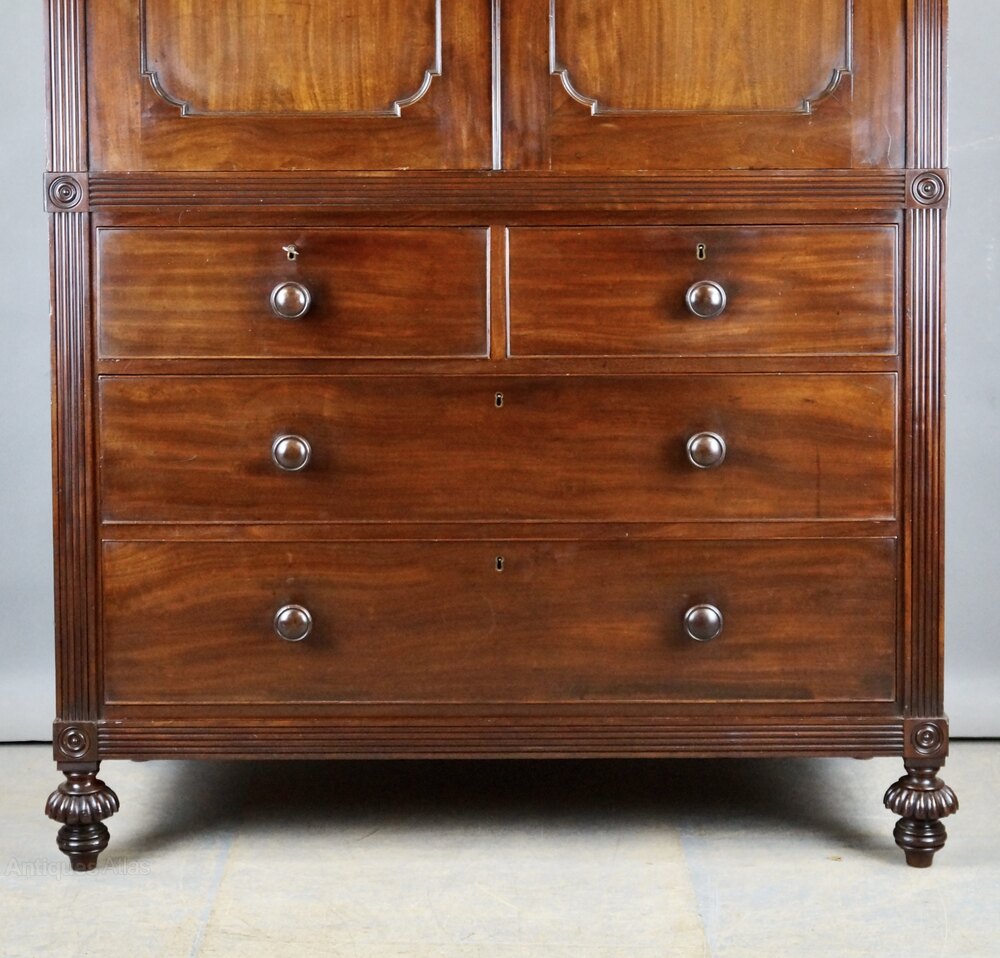 A superb quality Cuban mahogany Linen Press. Of very unusual design, the press stands on turned and reeded feet with reeded moldings and pilasters and domino patera. The base has two long and two short cock-beaded drawers with oak and cedar wood drawer linings, original turned wooden knobs and working locks. The upper section with a pair of paneled doors, with astragal moldings, behind which are a full compliment of original sliding trays and atop a reeded cornice. The press is in very good and original condition and retains a good colour and waxed patina. 1870mm high, 1160mm wide and 570mm deep. English. Circa 1840.W J Gravener Antiques is a family owned business, started in 1963 by William who was joined by son, Mark in 1981 and continues today with the same ethos of dealing in fine quality English and Continental furniture, mirrors and decorative objects, from the 18th & 19th centuries. Now under the stewardship of Mark and his wife, Louise, we take pride in maintaining the high standards which William set more than 50 years ago.