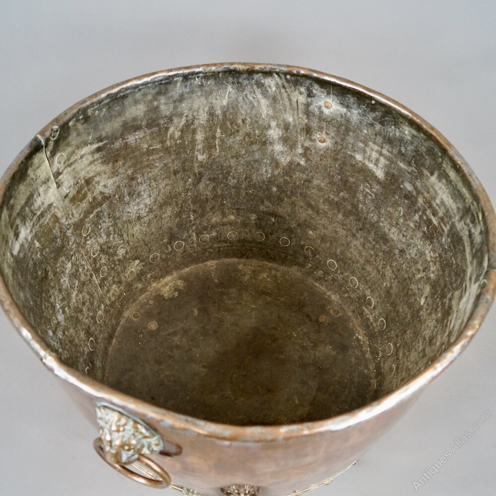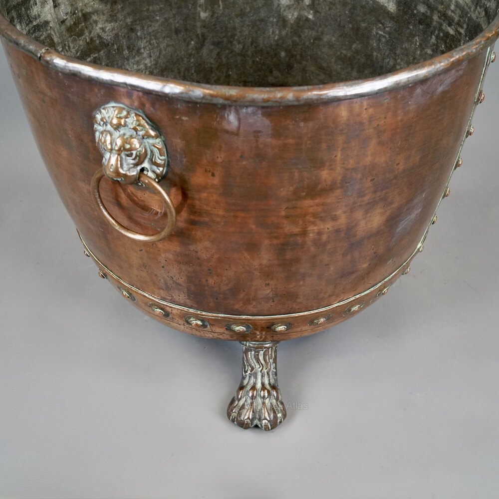 A very large Victorian copper log bin. With Lions mask ring handles and paw feet. In good and original condition. 510mm high and 610mm diameter. English. Circa 1860.W J Gravener Antiques is a family owned business, started in 1963 by William who was joined by son, Mark in 1981 and continues today with the same ethos of dealing in fine quality English and Continental furniture, mirrors and decorative objects, from the 18th & 19th centuries. Now under the stewardship of Mark and his wife, Louise, we take pride in maintaining the high standards which William set more than 50 years ago.