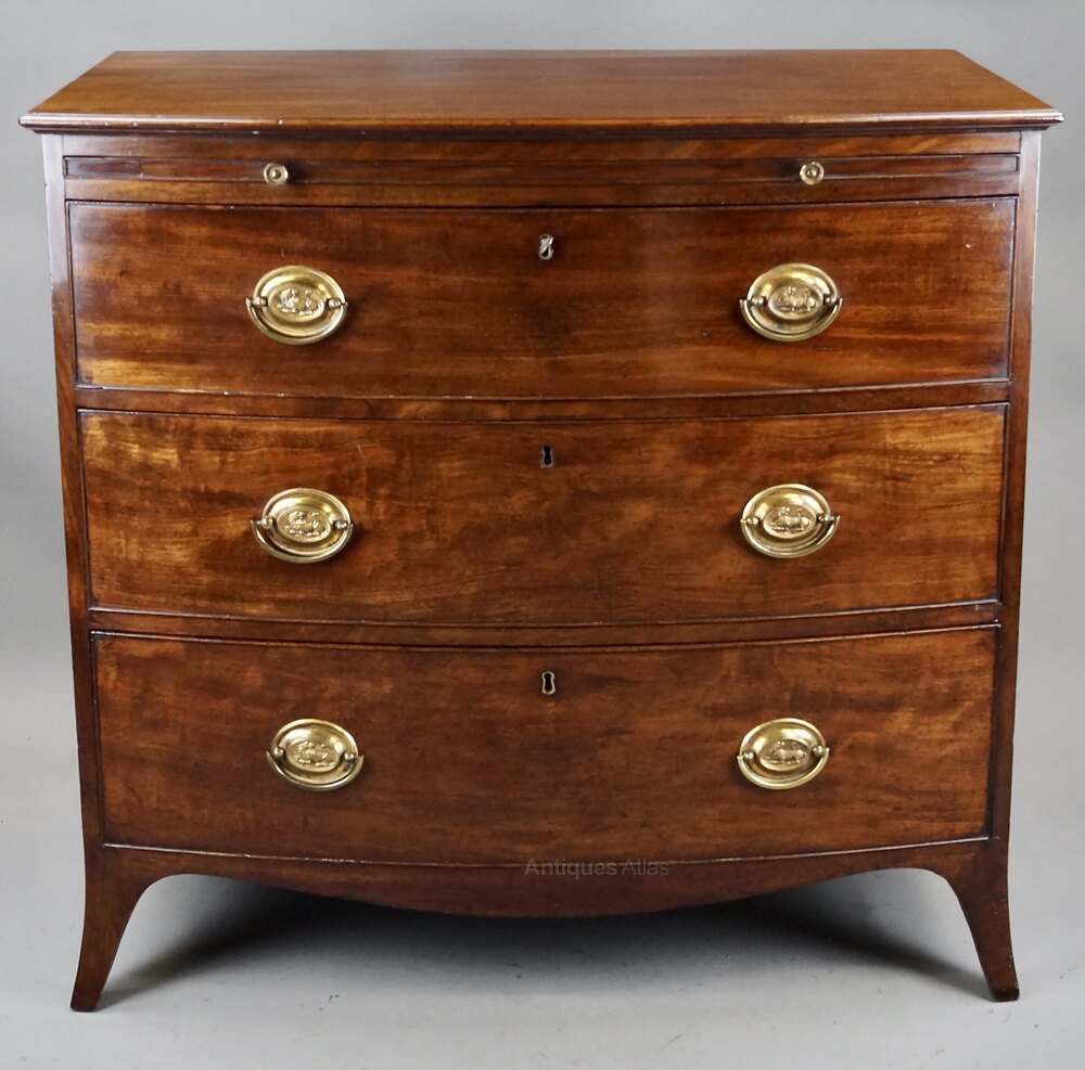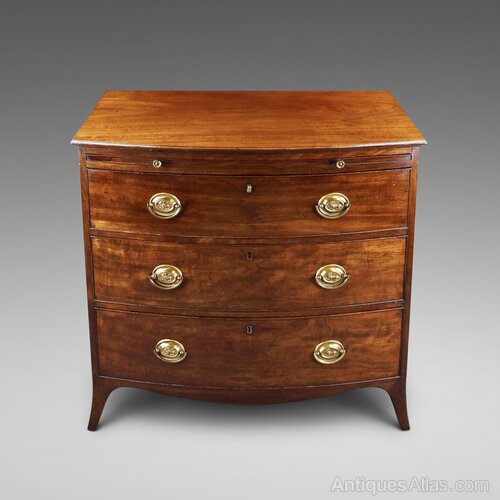 A George III Mahogany Bow-Fronted Chest Of Drawers. Raised on splay feet with a shaped apron and above three long drawers, with lovely original oval handles, and a brushing slide. In very good and original condition and with a mellow colour. 900mm high, 950mm wide and 530mm deep. English. Circa 1820.W J Gravener Antiques is a family owned business, started in 1963 by William who was joined by son, Mark in 1981 and continues today with the same ethos of dealing in fine quality English and Continental furniture, mirrors and decorative objects, from the 18th & 19th centuries. Now under the stewardship of Mark and his wife, Louise, we take pride in maintaining the high standards which William set more than 50 years ago.