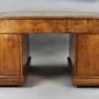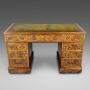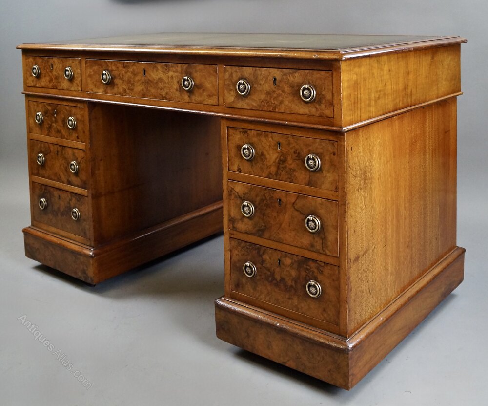 A Victorian Burr Walnut Pedestal Desk. With a lovely colour and raised on a plinth base with discrete castors under. The desk has nine drawers all with ring handles and is finished all the way around and with a velum green leather writhing surface with gilt and blind tooling. In very good condition. 790mm high, 1310mm wide, 690mm deep and the knee-hole measures 610mm high and 540mm wide. English. Circa 1860.W J Gravener Antiques is a family owned business, started in 1963 by William who was joined by son, Mark in 1981 and continues today with the same ethos of dealing in fine quality English and Continental furniture, mirrors and decorative objects, from the 18th & 19th centuries. Now under the stewardship of Mark and his wife, Louise, we take pride in maintaining the high standards which William set more than 50 years ago.