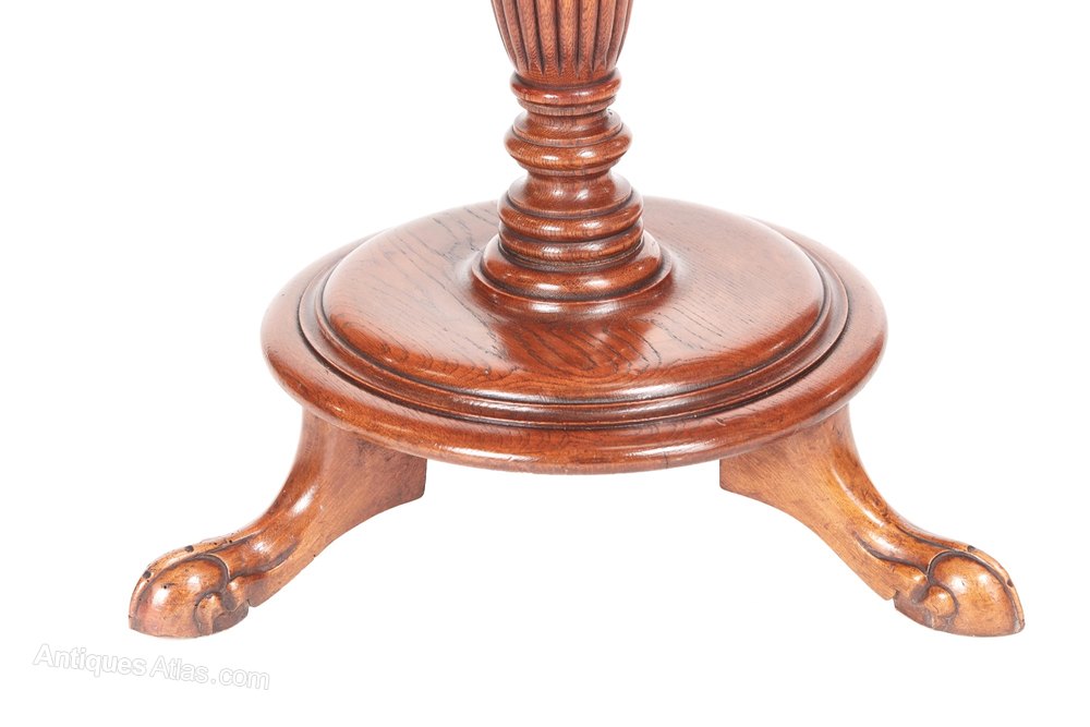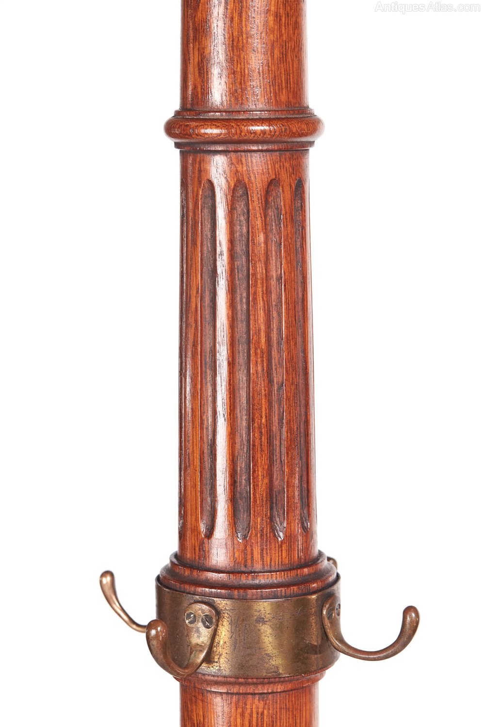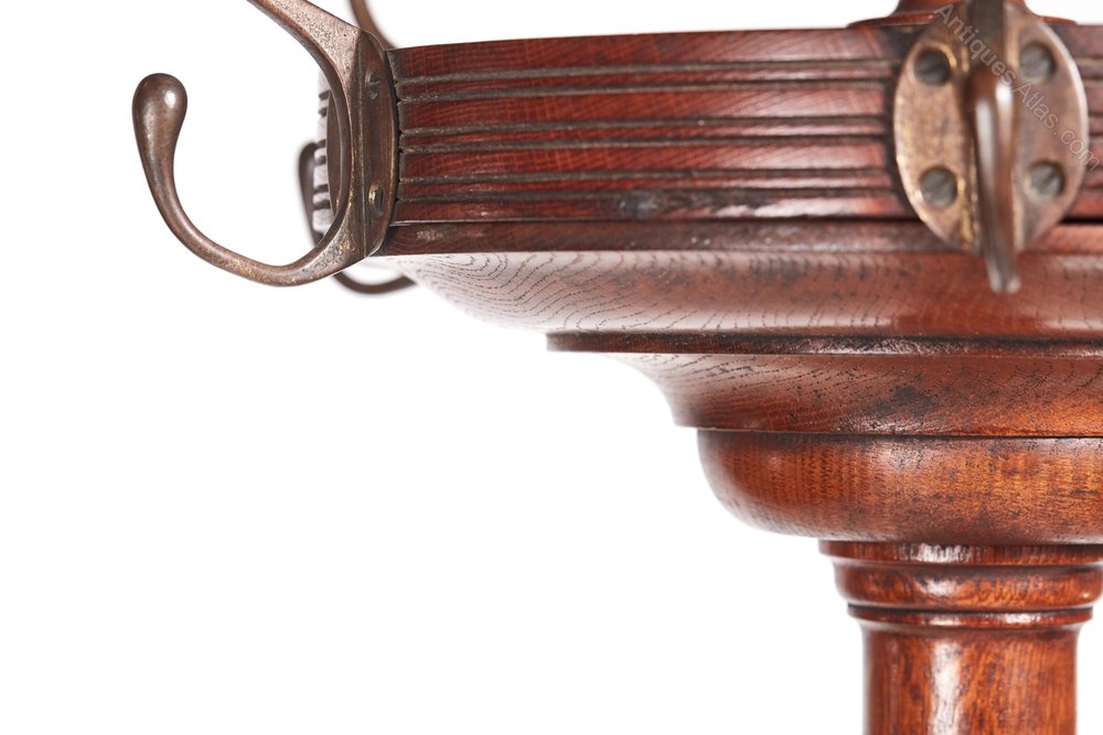 Unusual Victorian oak hat and coat stand, with revolving top and six original brass hooks, lovely turned reeded column on a round platform base raised on three shaped legs with claw and ball feet.Lovely colour and condition