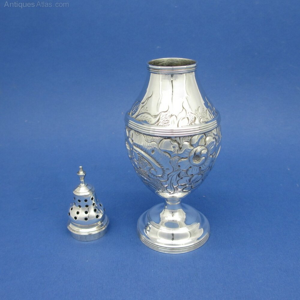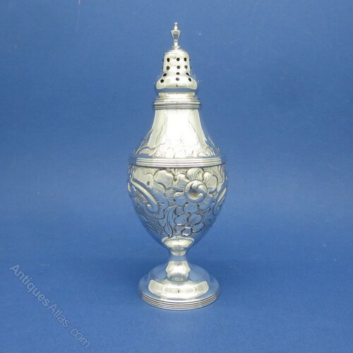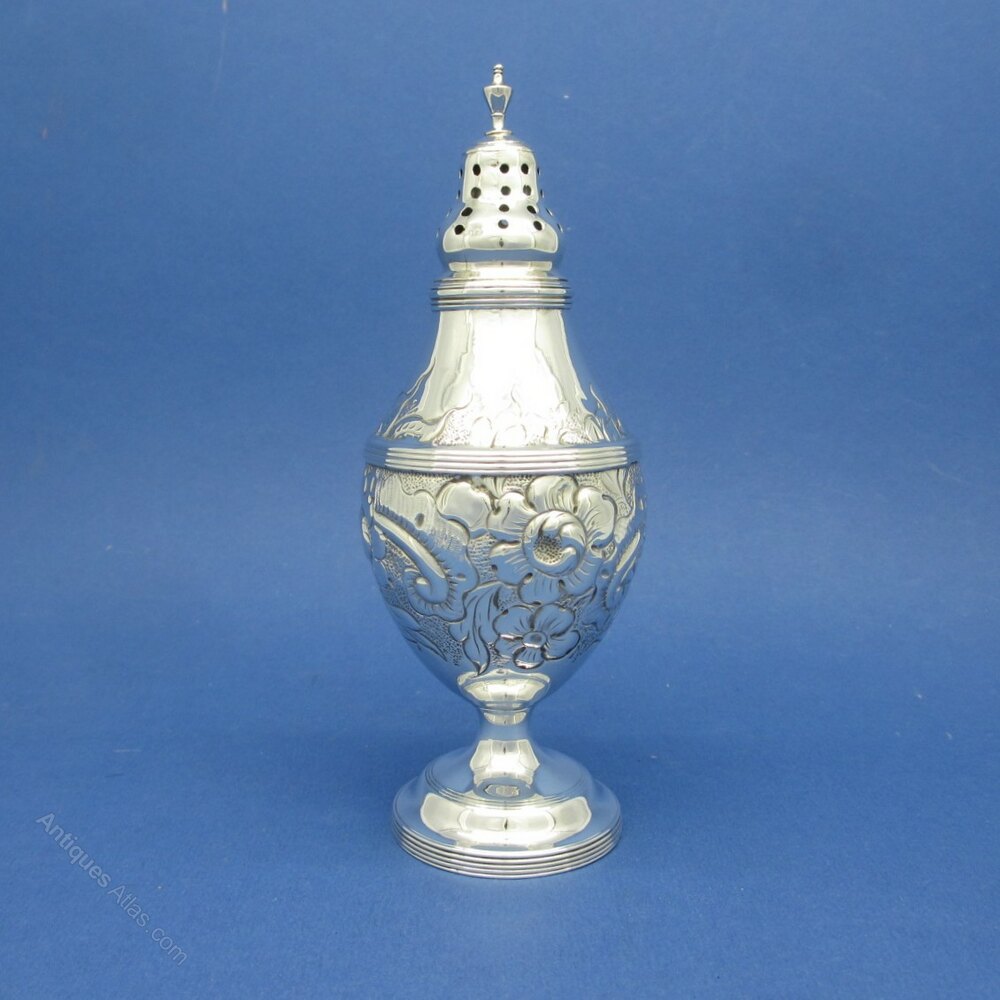 This is a George III Silver Sugar Castor with Embossed Floral Decoration.Believed to be hallmarked in the London Assay Office in 1815 which included the Duty mark (hallmarks struck on edge of base).