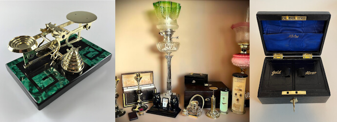 Selling quality antique desk items including weighing scales, inkwells, oil lamps, and leather stationery and document boxes.
