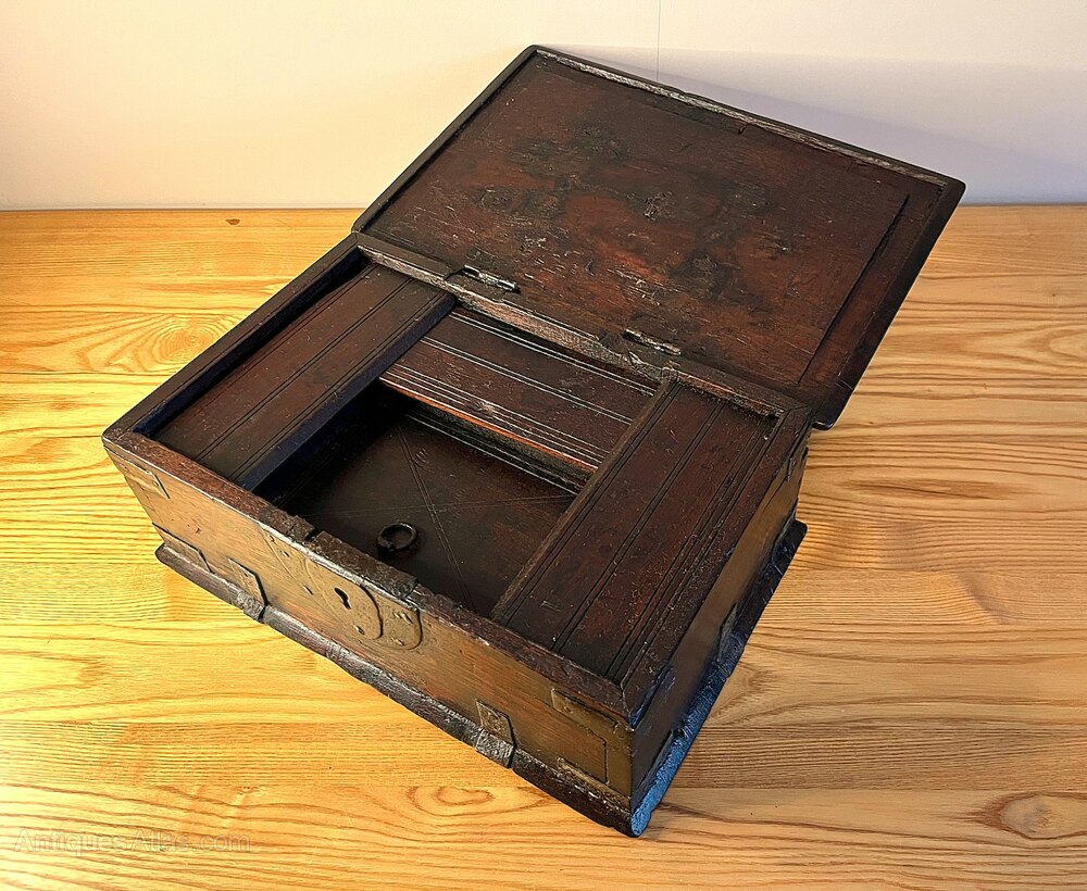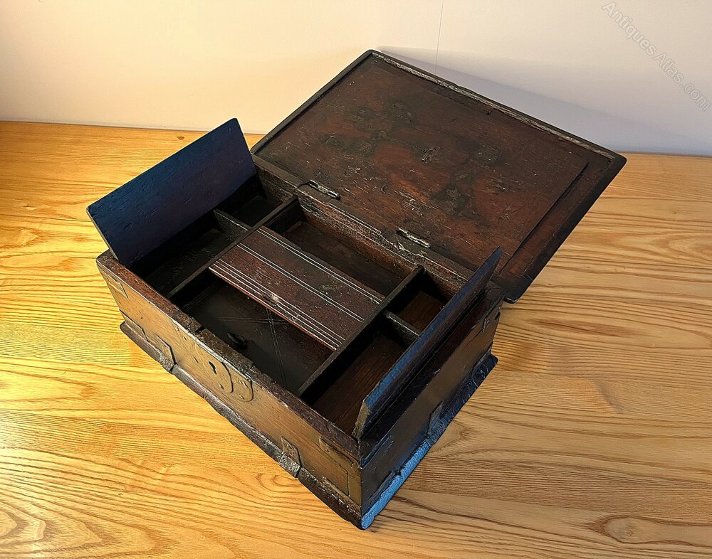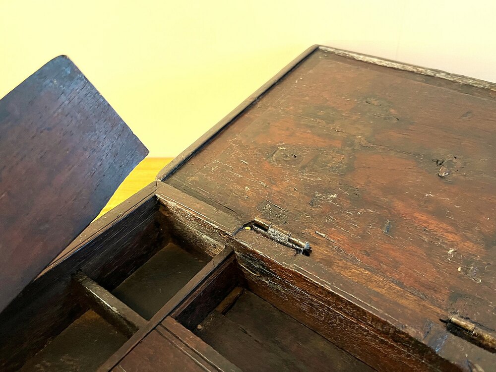A lovely 17th Century Spanish Hardwood box with four internal compartments. Three compartments have lift-up lids with the centre rear draw having a sliding lid. As can be seen in the photos, the lid to the left compartment has a loss to the top left-hand corner. The box measures 32 cm wide, 21.1 cm deep, and 11.2 cm high.If you have any questions, please get in touch.