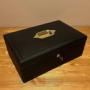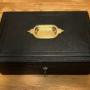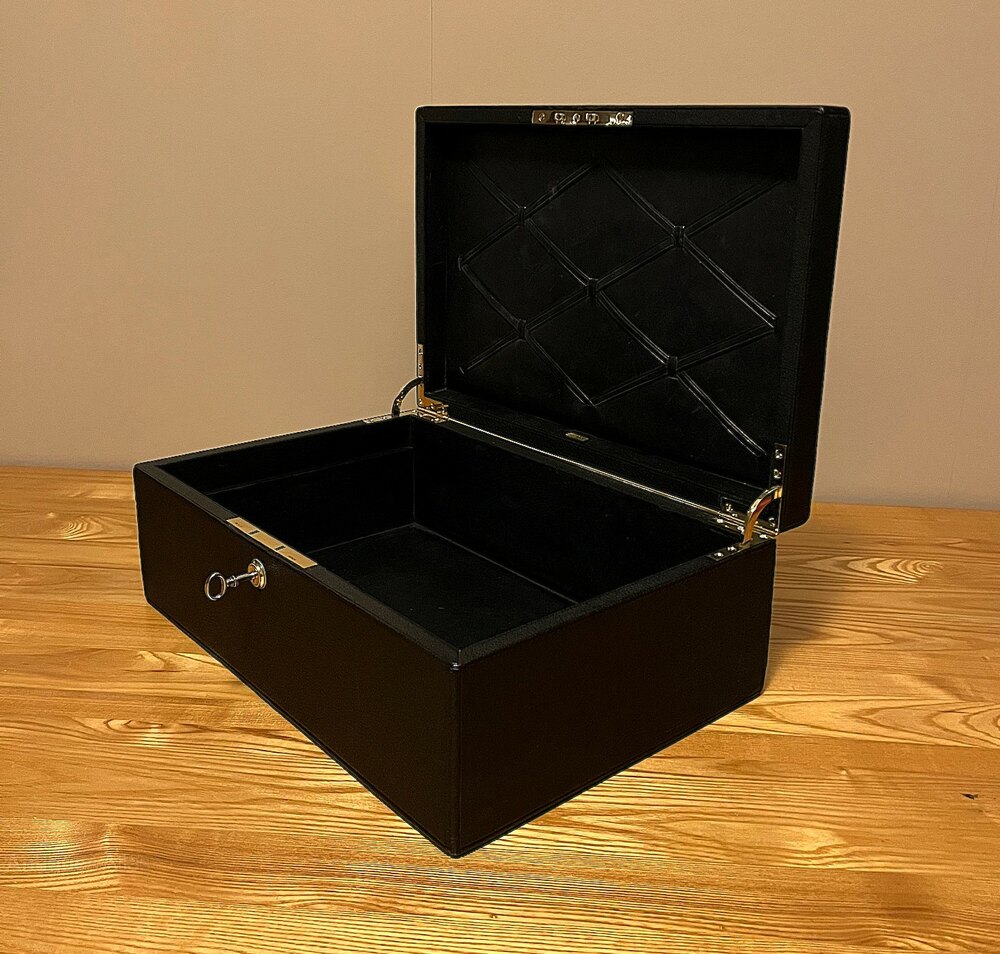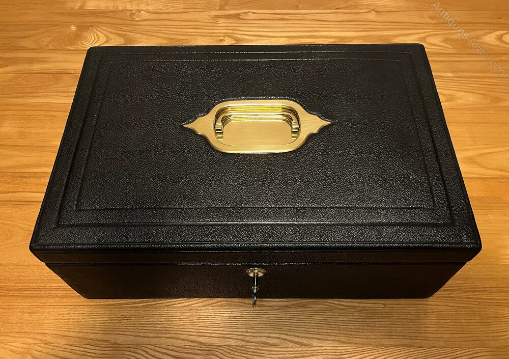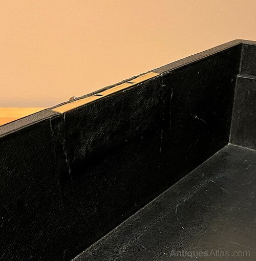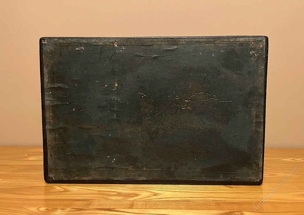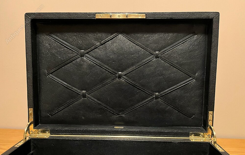 A fabulous Parkins & Gotto black leather despatch box with Bramah lock and key. As can be seen in the photos, the box is in excellent antique condition. The gilt stamp to the rear of the inside of the lid states ’Parkins & Gotto Manufacturers 25 Oxford Street’. This suggests that the box was made before 1860 when 24 Oxford Street was added to their premises. The Bramah lock works as it should and the box locks nicely with a satisfying click. At some point in its history, the lock has been removed (possibly for cleaning and servicing) as the leather has been cut to the inside of the box in order to remove the locking mechanism. The leather has been re-adhered and this is barely noticeable. The exterior leather covering is of very high quality and is in excellent condition given the age of the box. The box measures 40.6 cm wide, 26.8 cm deep, and 15 cm high. A beautiful box in such lovely condition.If you have any questions, please get in touch.